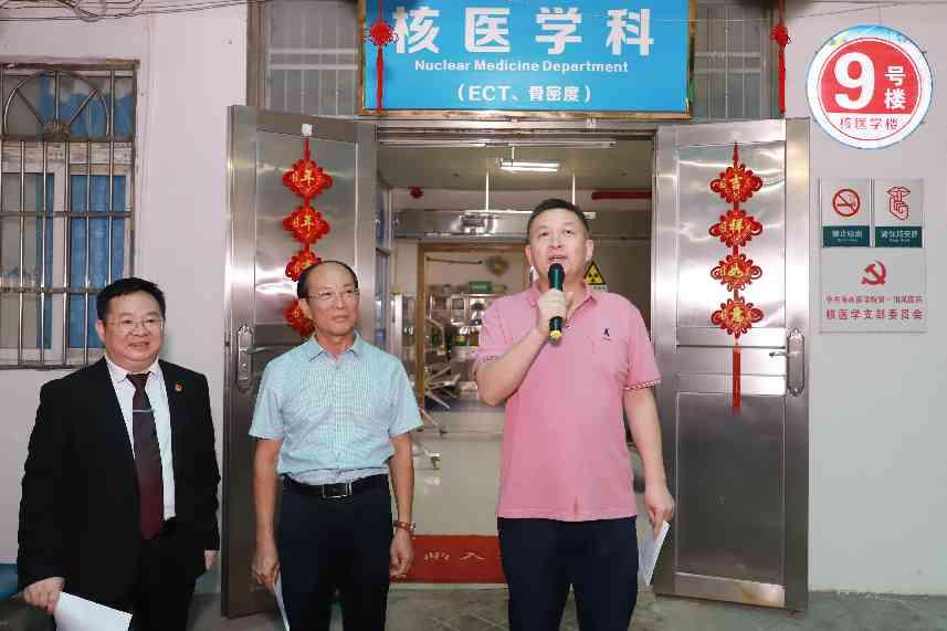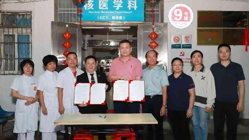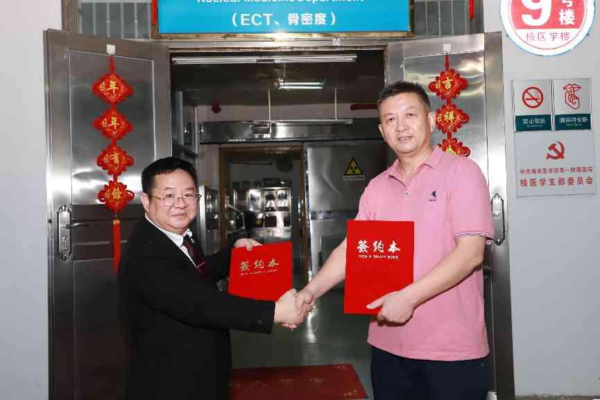 在正式签字之前,王身坚和肖欢分别代表双方合作单位致辞。王身坚介绍了双方合作共建的目的和意义,肖欢就双方合作共建的主要内容和预期目标作了说明。随后,黎同柏和肖欢分别代表共建单位现场签署了《马克思主义学院与第一附属医院核医学科人文医学实践创新共建协议》。最后,王身坚、肖欢和双方领导班子共同为“马克思主义学院(人文社会科学部)人文医学实践创新工作室”揭牌,全体参与人员合影留念。签字(揭牌)仪式结束后,核医学科还为现场参与人员开展了免费骨骼健康体检。
