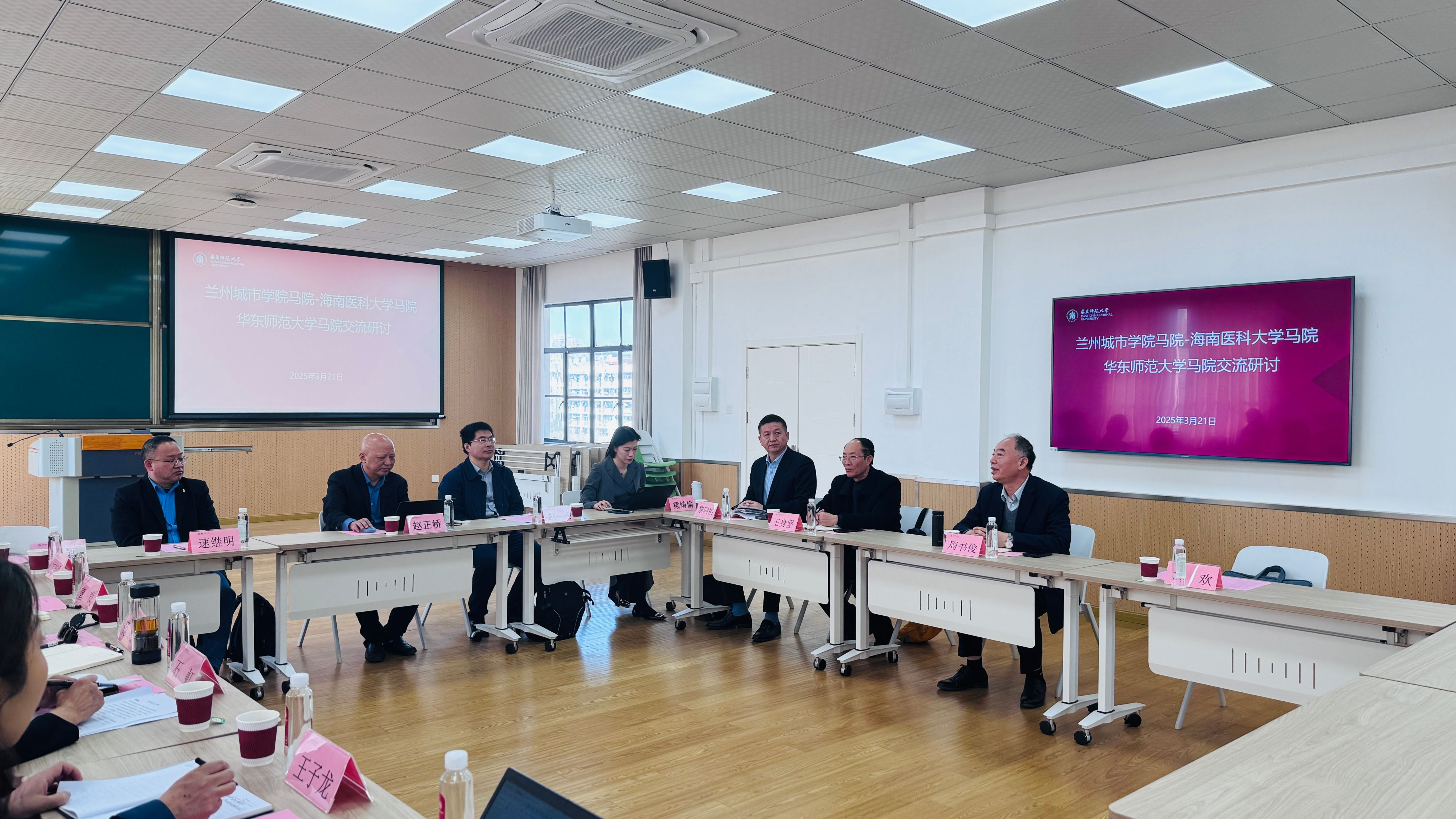 次日(3月21日),海南医科大学马克思主义学院(人文社会科学部)一行还赴华东师范大学马克思主义学院进行了考察交流。华东师范大学马克思主义学院党委书记赵正桥、副院长赵勇等与兰州城市学院名誉院长范鹏、党委书记、路易·艾黎研究中心主任石虹和部分教师代表参与座谈。三方围绕学科专业建设、有组织科研模式、师资队伍建设及思政课教学改革等展开讨论,华东师范大学重点分享了科研协同创新机制与成果转化经验,兰州城市学院分享了在社会服务方面的经验,这些经验为海南医科大学的学科发展和社会服务提供了新思路。
