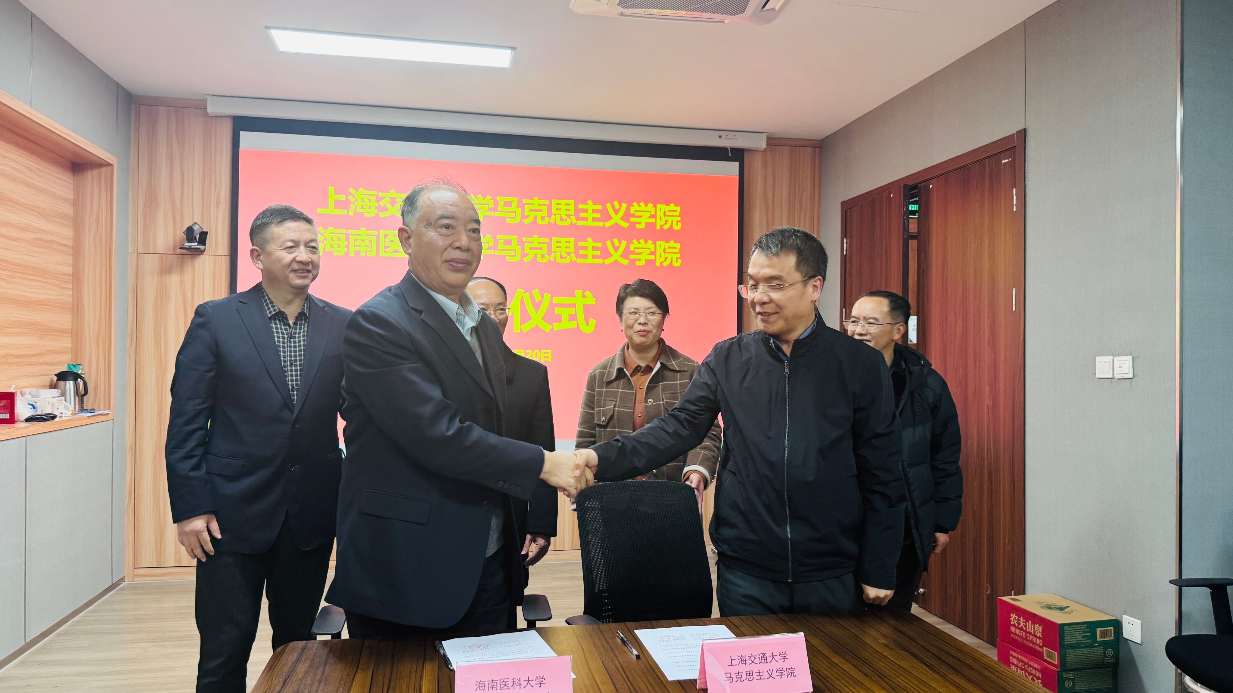 2025年3月20日,海南医科大学马克思主义学院(人文社会科学部)与上海交通大学马克思主义学院结对共建协议签约仪式在上海交通大学闵行校区马克思主义学院A500号会议室举行。签约仪式由上海交通大学马克思主义学院党委书记余新丽主持,双方出席人员包括:海南医科大学马克思主义学院(人文社会科学部)院长周书俊、党总支书记王身坚、副书记黎同柏、党政办公室主任刘欢;上海交通大学马克思主义学院院长邢云文、党委书记余新丽、党委副书记杜夏明、党政办公室主任唐慧敏等。这是两校深入贯彻落实“海医再出发·高质量发展大会”精神、深化“支持海医高质量发展共同体”建设的重要举措,也是海南省示范马克思主义学院培育建设的关键一步。