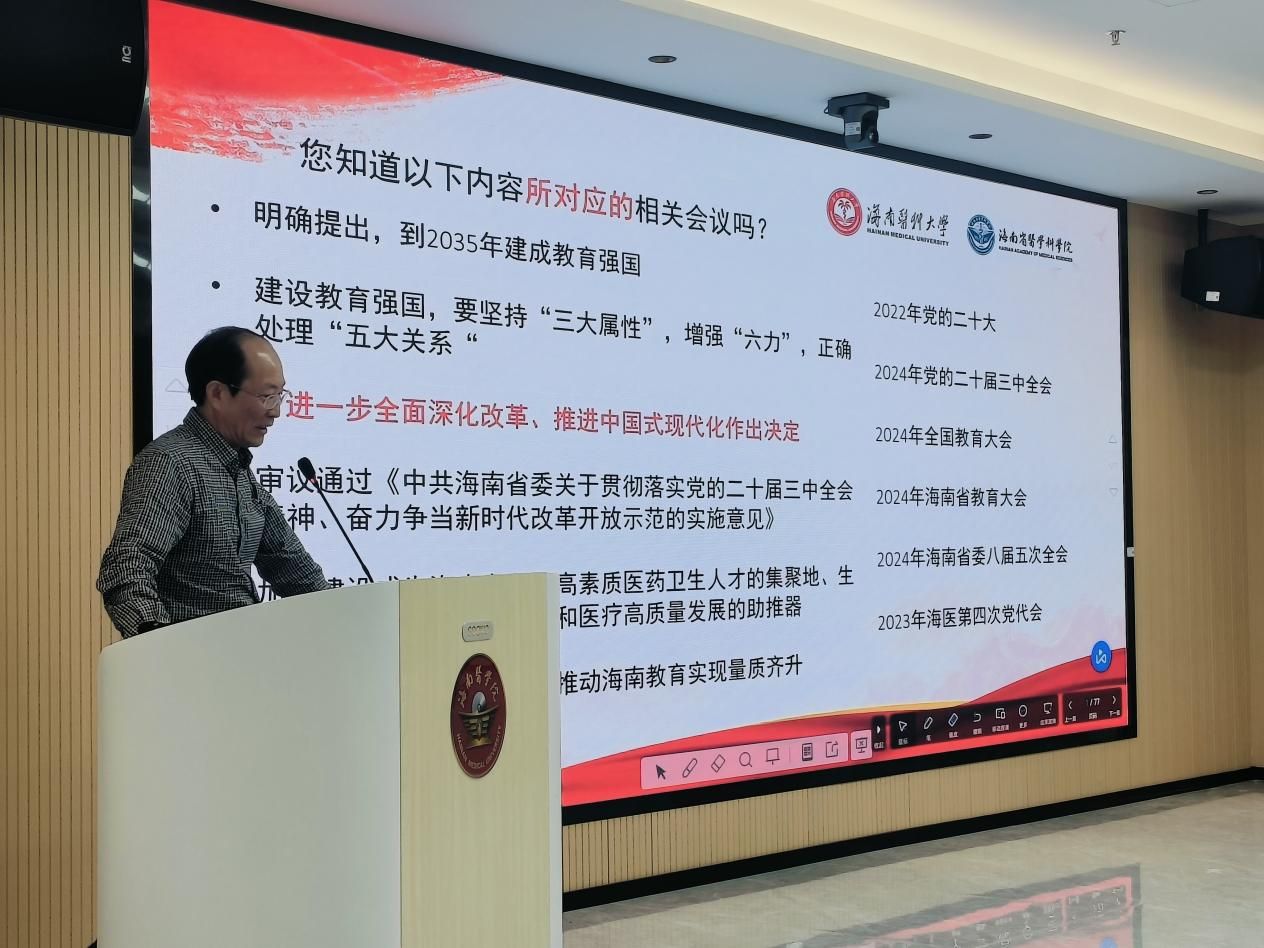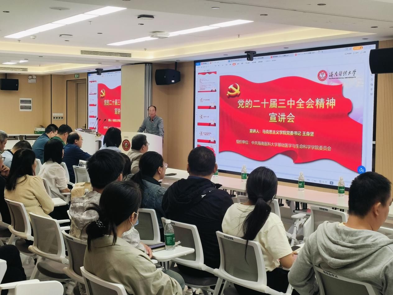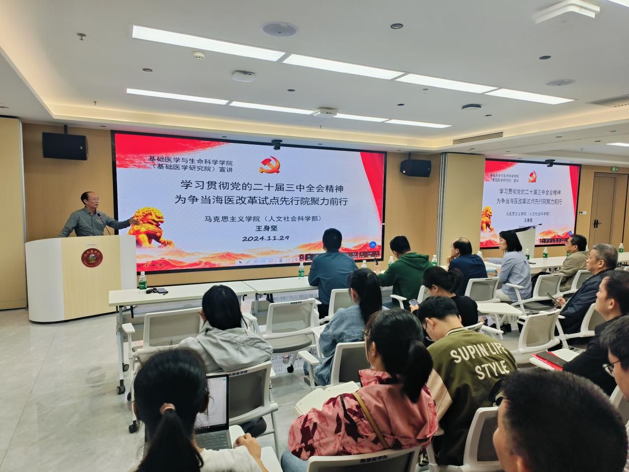 2024年11月29日上午,热带医学院的会议室座无虚席,一堂精彩生动的宣讲会在此举行。主讲嘉宾是海南省党的二十届三中全会精神宣讲团成员、我校马克思主义学院(人文社会科学部)党总支书记王身坚。宣讲会由基础医学与生命科学学院党委书记王晗主持。基础医学与生命科学学院130余名师生党员参加学习。
