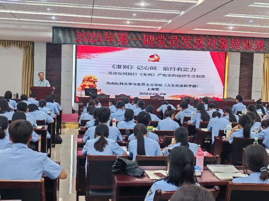 2025年6月8日,我院党总支书记王身坚应邀赴海南政法职业学院,为该院2025年第一期党员发展对象培训班作专题辅导报告。本次辅导报告以“贯彻落实《关于新形势下党内政治生活的若干准则》,严格党的组织生活制度”为主题。王身坚书记紧扣新时代党的建设总要求,以《<准则>记心间,前行有定力》为题,结合其深厚的党建理论研究功底和丰富的实践经验,与海南政法职业学院百余名党员发展对象进行了深入交流。