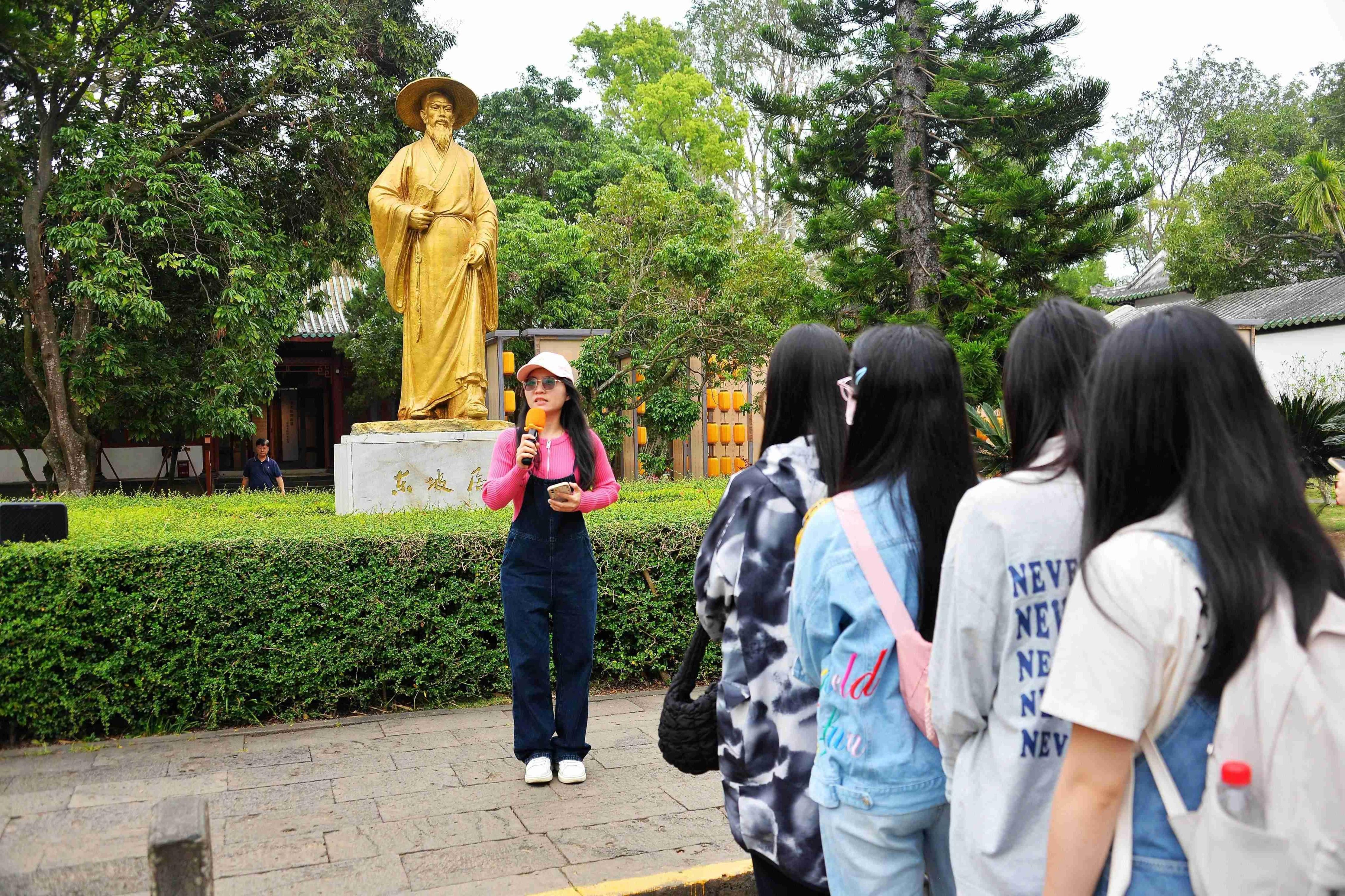 上午,师生首站抵达儋州东坡书院。研修活动在景区门口的开幕致辞中拉开序幕,学院党总支书记王身坚强调:“东坡文化是中华优秀传统文化的璀璨明珠,希望老师同学们通过实践体悟苏轼‘九死南荒吾不恨,兹游奇绝冠平生’的豁达胸襟和对海南的深厚感情,汲取文化自信的精神滋养。”在专业讲解员带领下,师生依次参观书院主殿“载酒堂”、钦帅堂等历史建筑,聆听苏轼贬谪海南期间创办州学、推广农耕技术、与黎民共处的故事。参观结束后,师生齐聚苏轼铜像前,教师代表陈娇声情并茂地朗诵《别海南黎民表》《六月二十日夜渡海》等经典诗词,演绎诗词的韵律和意境之美,师生报以热烈掌声。随后,西英格兰学院影像技术专业程煜坤、护理专业王北芳、康复专业张馨日联袂登台,角逐“诵读苏轼名篇擂台赛”,通过声情并茂的演绎展现东坡诗词的魅力。经现场评审,三人分获奖项,学院教师为其颁发实践奖学金和奖品。