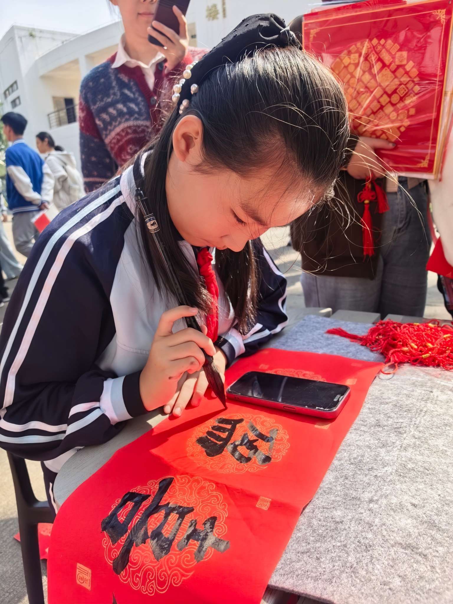 活动从上午九点持续至下午两点半,吸引了300余名师生及教职工家属热情参与。现场气氛热烈,有的师生精心挑选心仪的对联诗句请老师书写,有的在旁驻足欣赏、细细品味,更有不少师生在书法爱好者的指导下,亲手提笔体验,在红纸上写下属于自己的新春祝福。整个活动现场洋溢着欢声笑语,充满了文化气息与温情暖意。