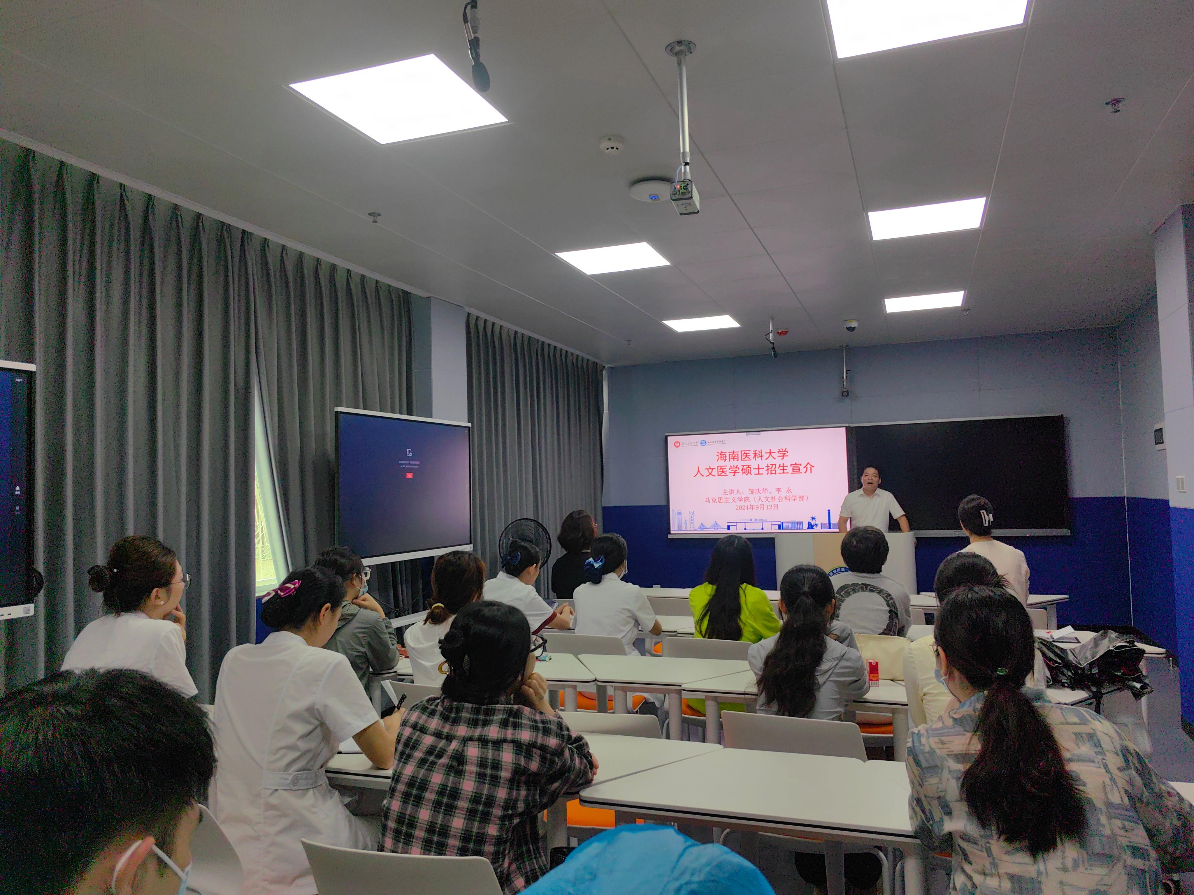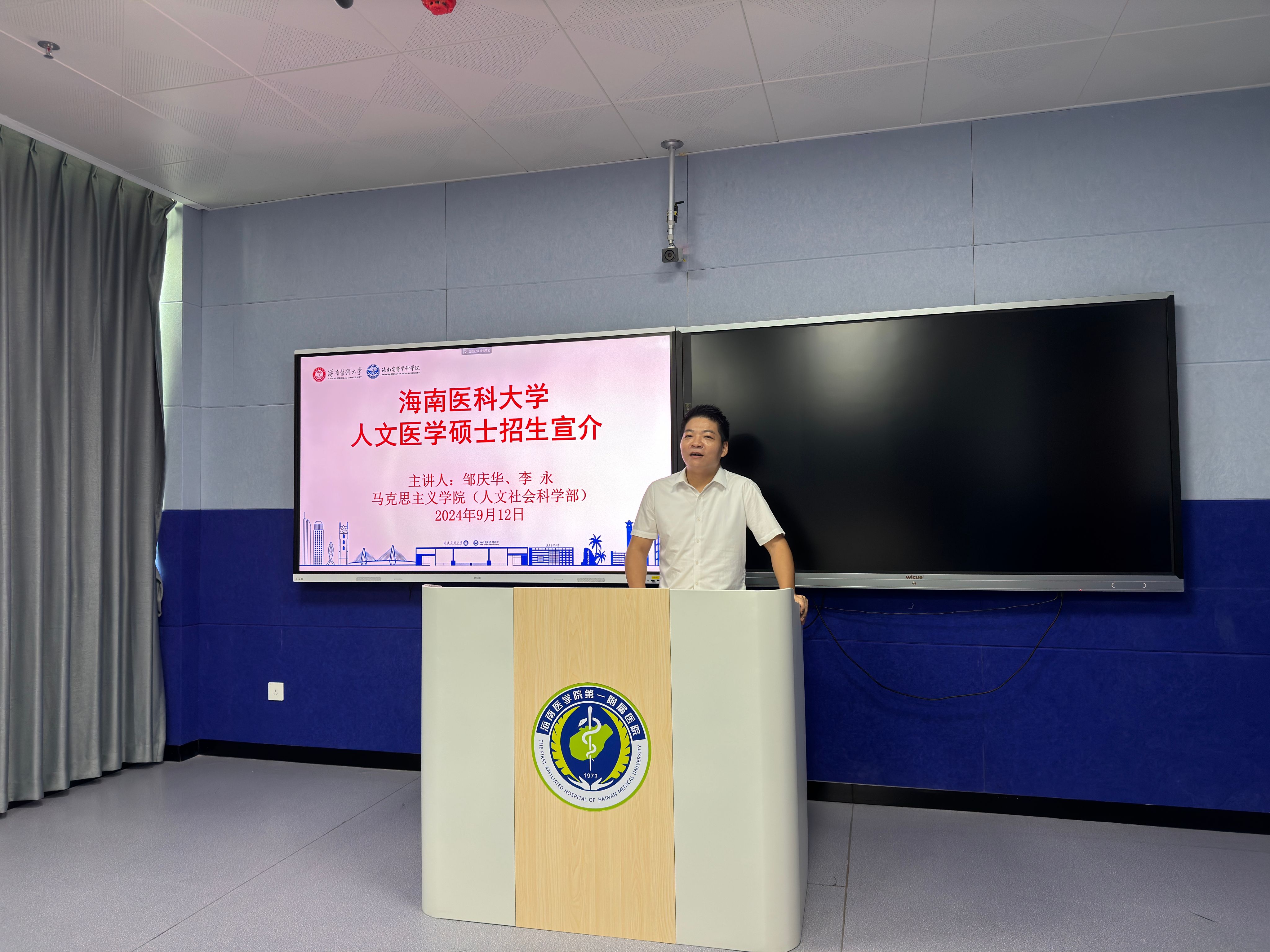 2024年9月12日上午,马克思主义学院在海南医科大学第一附属医院(海医一附院)临床技能实验教学中心402教室,举行2025年海南医科大学人文医学专业硕士研究生招生海医一附院专场宣讲会。学院副院长(主持工作)邹庆华教授、李永副教授两位人文医学专业硕士生导师参加了本次宣讲会。海医一附院曾德菲护士长、部分在岗医护人员以及有关实习生参加了本次宣讲会。