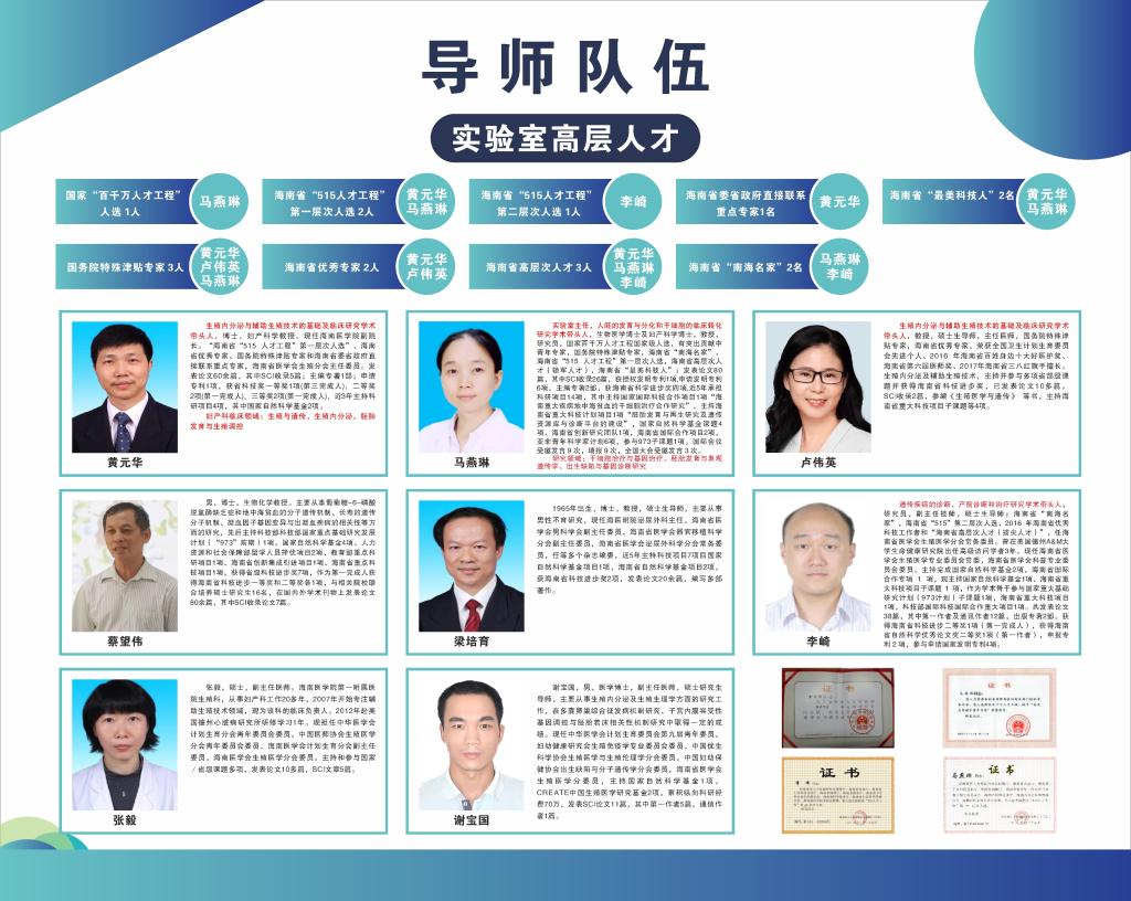 海南省人类生殖与遗传重点实验室近3年,引进博士后6名,博士4名,培养博士2名,引进硕士9名,选派了16名研究人员分别赴中山大学,广东省妇幼保健院,香港中文大学,美国德州心脏医学中心,贝勒医学院,郑州大学医学院,南方医科大学,日本富山大学等交流学习。