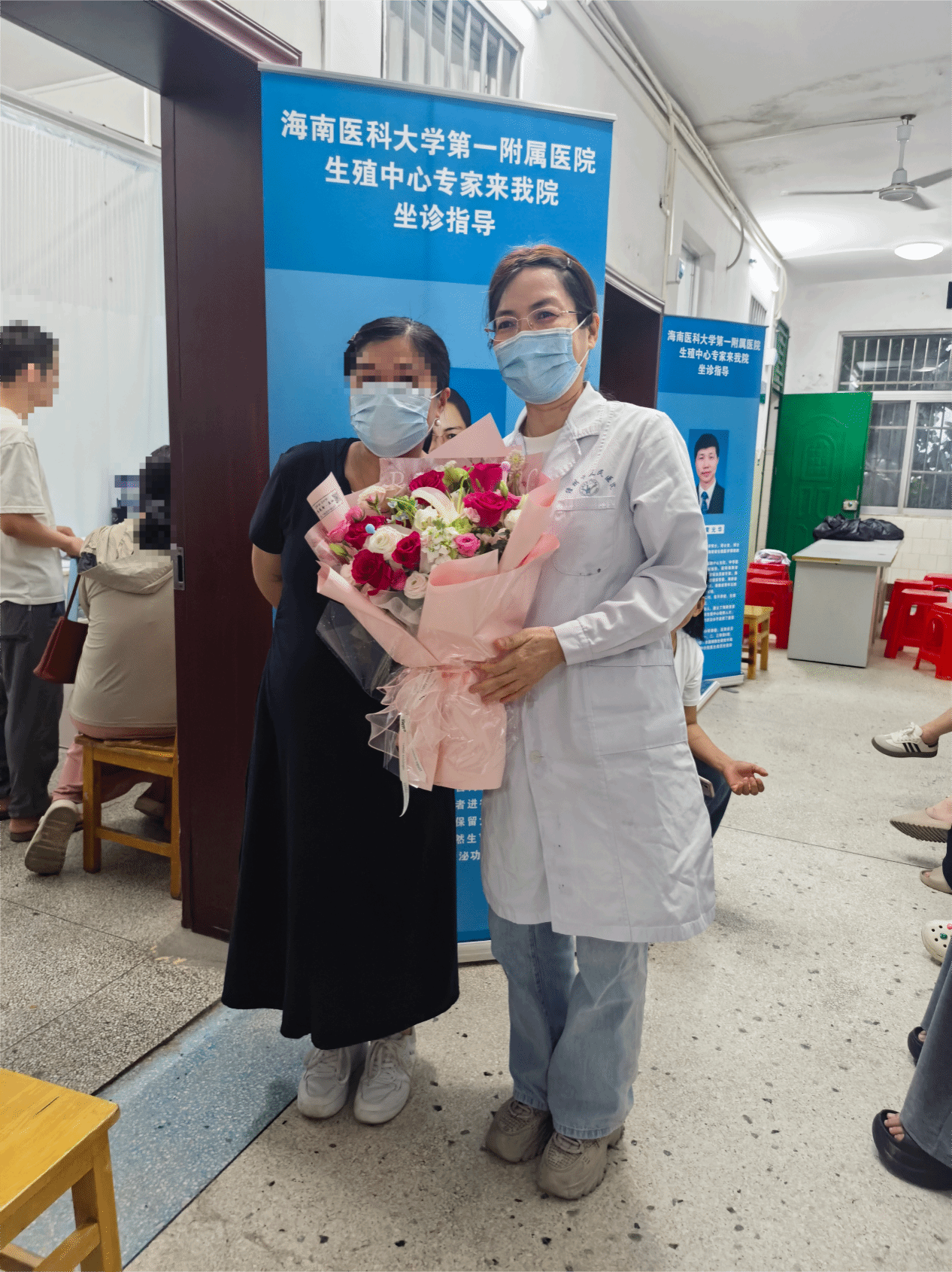 义诊小插曲2:这是一位晚婚的病友,就诊时已经是高龄状态,在尝试了一次人工授精未果后果断选择了试管婴儿助孕,不过因为高龄了,卵巢储备功能下降,第一个促排卵周期取卵了5枚,获得2枚胚胎,新鲜周期移植没有怀上,后来解冻周期移植倒是成功怀上了,但是孕1+月时胚胎停育了。之后该病友找到黎主任,黎主任重新评估患者情况,建议她先做宫腹腔镜手术再继续试管助孕,该病友同意了,做完宫腹腔镜手术,第二次取卵顺利,但是胚胎质量很差,黎主任便给病友进行减重、生长激素预处理等措施,第三次取卵获得一枚优质胚胎,移植后终于成功妊娠了,目前该病友已经孕18+周,今天也特意过来给黎主任送上鲜花表示感谢!