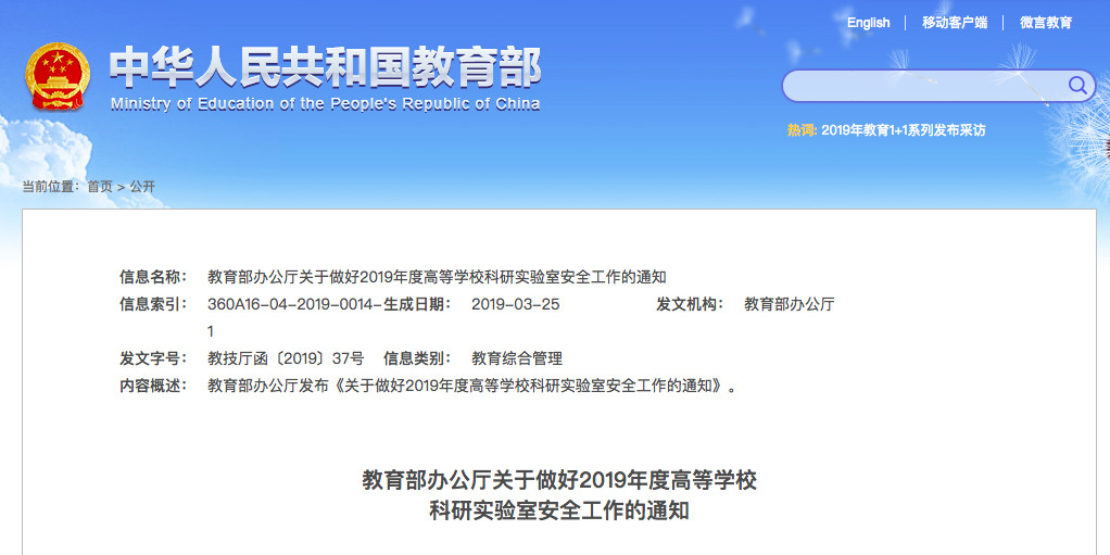 此外,教育部办公厅发布《关于做好2019年度高等学校科研实验室安全工作的通知》: