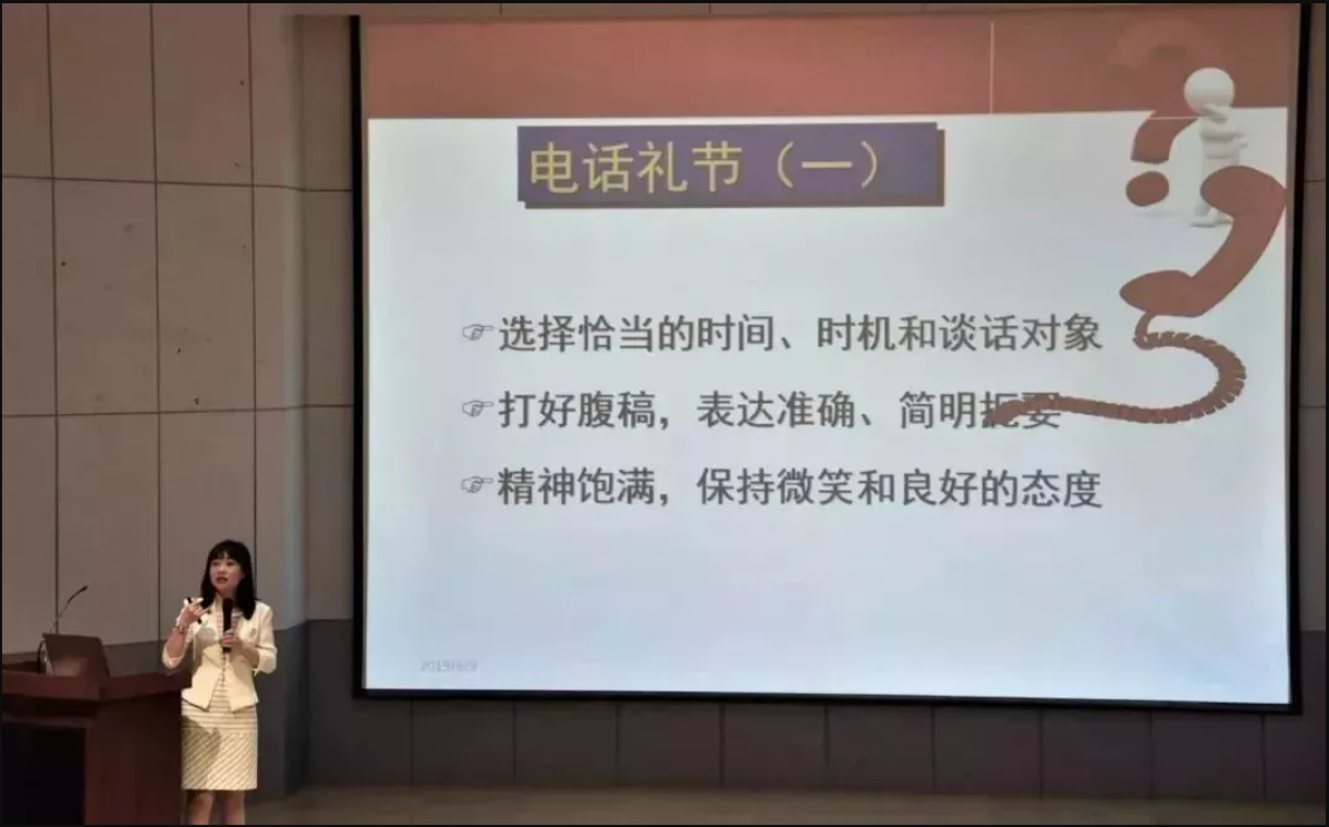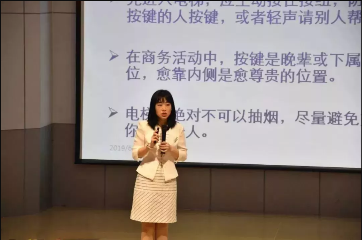 培训会伊始,李老师通过复旦大学“李彦宏与你面对面”讲座的反面案例引出话题,说明了在社交礼仪过程中应当依据对方的年龄、身份、职业、社交场合、关系等来判断如何更好地待人接物,做好自尊和尊他,这样才能避免在交际场合中出现尴尬的场景。