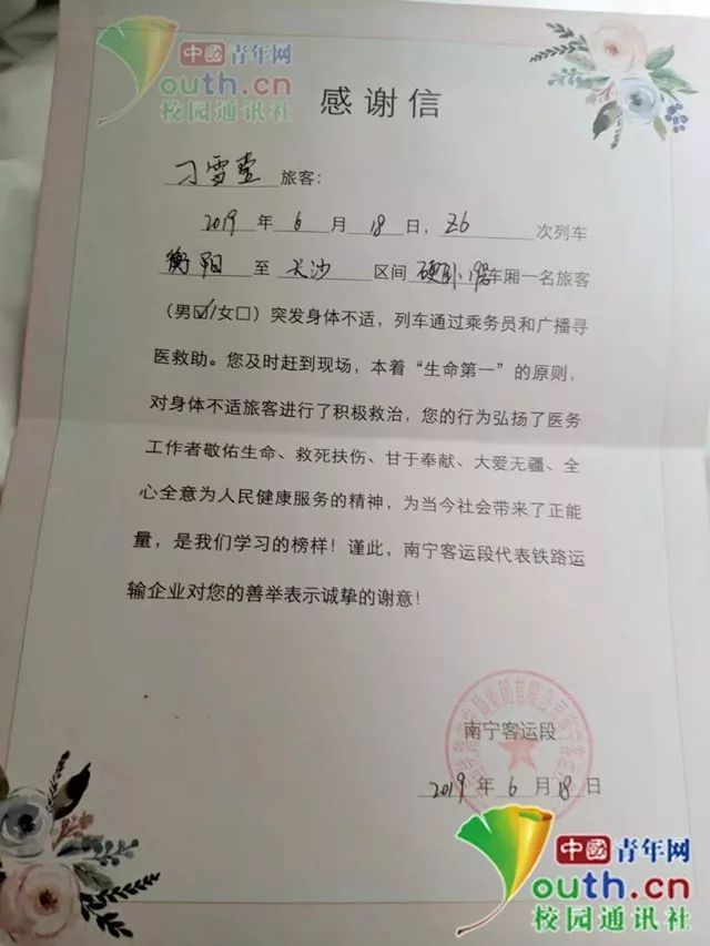 “您的行为弘扬了医务工作者敬佑生命、救死扶伤、甘于奉献、大爱无疆、全心全意为人民健康服务的精神,为当今社会事业来了正能量,是我们学习的榜样!谨此,南宁客运段代表铁路运输企业对您的善举表示诚挚的谢意!”