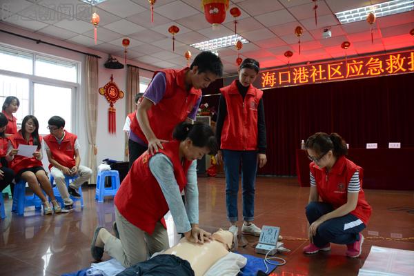启动仪式结束后,为了使社区群众更好的应对突发事件,我校青年志愿者对大家进行了应急救护知识培训。全体志愿者及社区群众积极参与,努力配合,在实践中学习,在体验中交流。与此同时,还有附属医院的医生和经过培训的同学为困难群众测量血压,指导病情。大家尽心尽力,共同参与,共同收获。