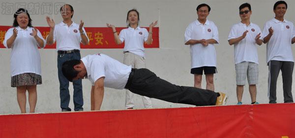 陈玉民副校长首先致开幕词。一向坚持锻炼的他率先在主席台上连续完成三十个俯卧撑作为开场,并向与会师生提出以下几点期望:正确把握“三走”的活动性、课外性,掌握锻炼技巧、安全锻炼的基础上,充分发挥年轻人朝气蓬勃的特性,养成激扬青春的好习惯、练就为祖国奉献的好身体,从而更好地享受大学生们的青春好年华,不断培养自强不息、迎接挑战、超越自我的精神,在运动中展现海医学子的青春活力;同时还倡导全体师生每周至少参加三次体育锻炼活动,坚持“每天锻炼一小时、健康工作五十年、幸福生活一辈子”。