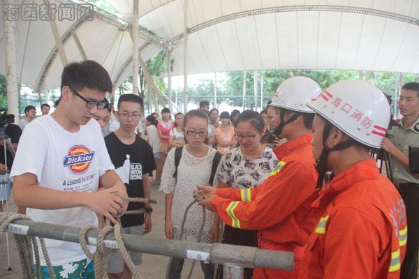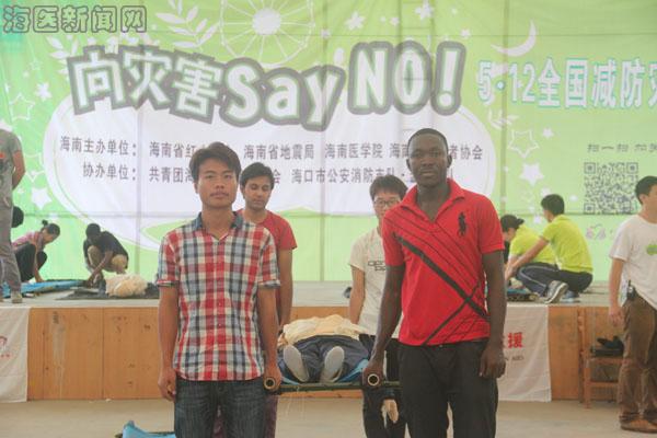 救援演练首先模拟某村庄受洪灾来袭水位增高,村长进行广播呼吁青年紧急转移村中老人儿童。在海口市公安消防支队金盘中队的消防官兵指挥下,我校的学生反应迅速、心灵手巧,运用绳索、化肥袋、竹竿等生活中常见的物料自制简易担架。救援队中几位黑皮肤的留学生很抢眼,来自巴基斯坦的Zeeshan Qasim说,我要学以致用,将这些本领带回国去传授给家乡的老百姓。