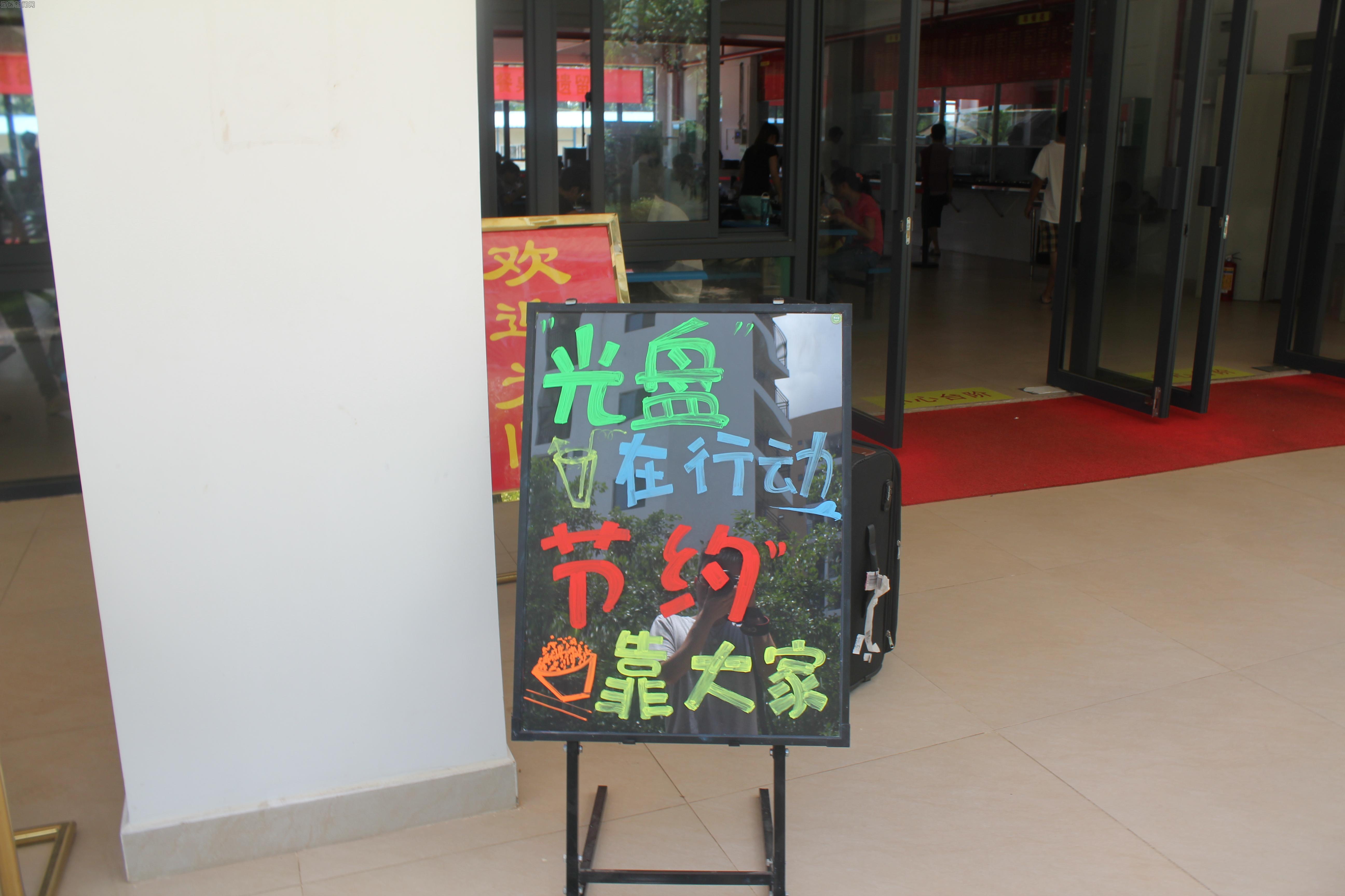 活动期间,食堂门口放置的荧光宣传板吸引了很多同学驻足,宣传板上清楚地介绍了“光盘行动”的重要性和意义。校学生会安排了工作人员在就餐时间执勤,倡导大家“光盘”,并对本次活动进行了宣传。工作人员还与我校很多学生在食堂门口进行了“‘光盘’在行动,节约靠大家”的横幅签字仪式,在场的同学纷纷在横幅上签下了自己的名字,以表示对“光盘”行动的认同和拒绝浪费的决心。