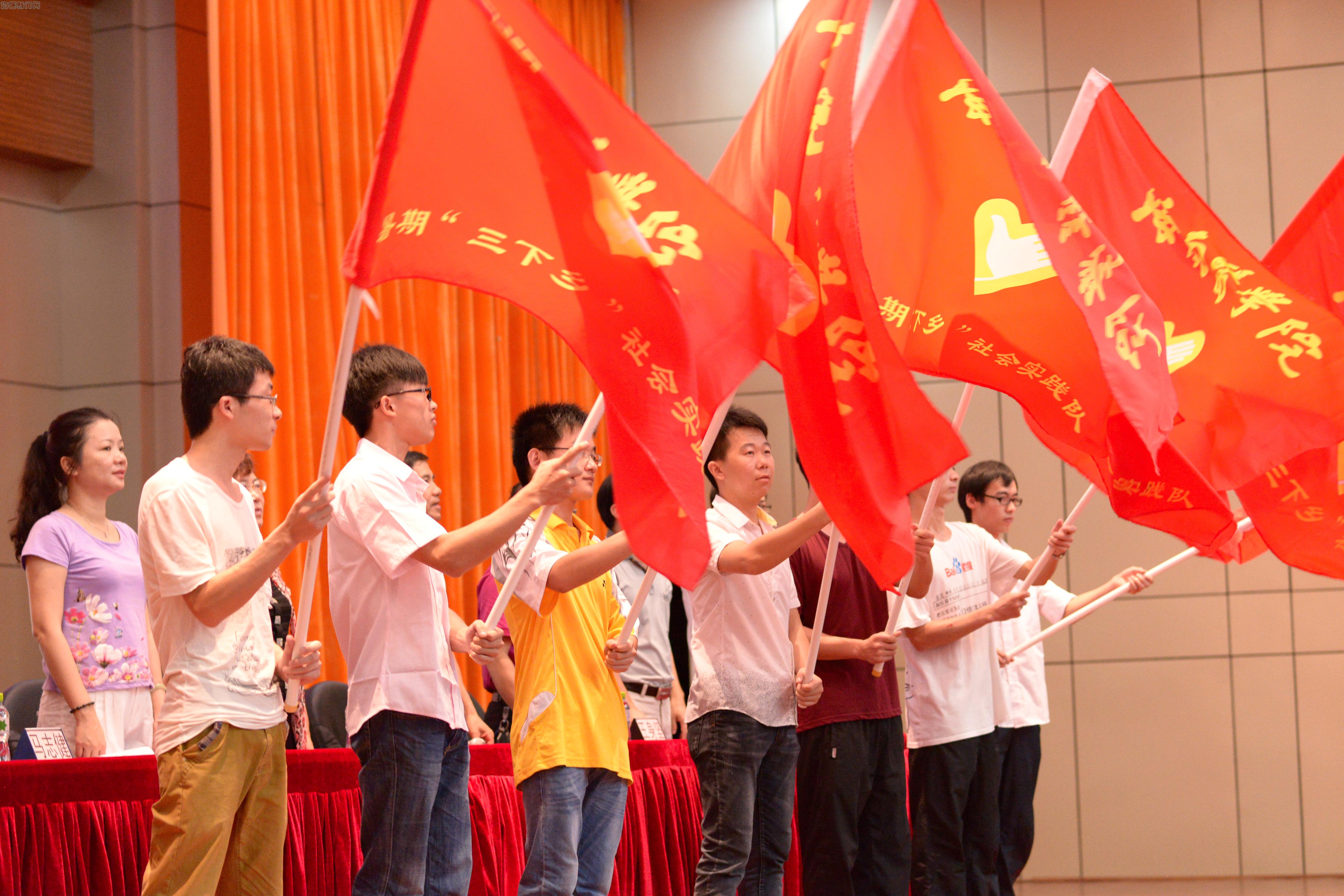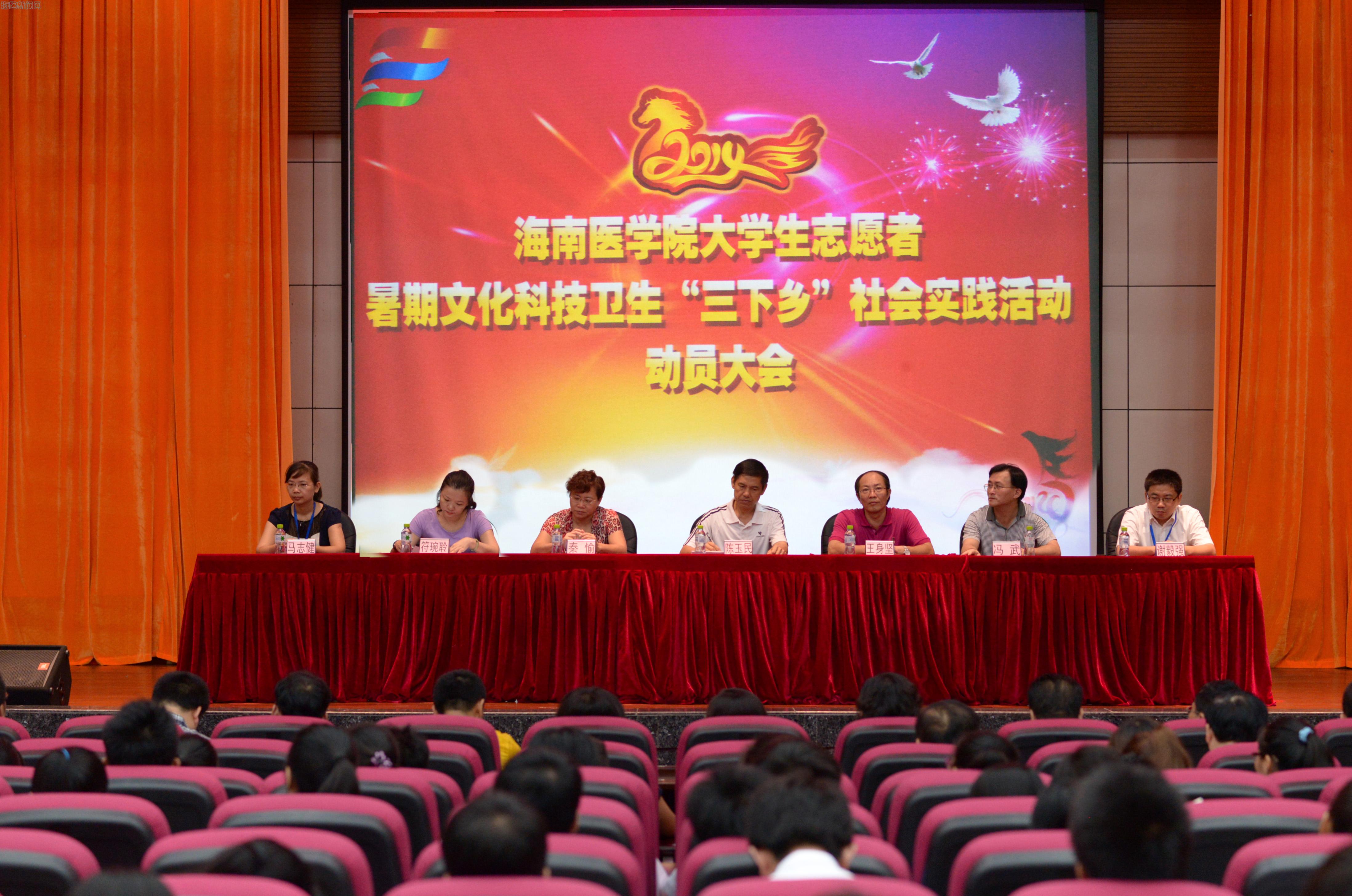 2014年大学生志愿者暑期文化科技卫生“三下乡”社会实践活动动员大会在国际报告厅隆重举行。学校陈玉民副校长、宣传新闻部王身坚部长、组织人事部秦愉部长、学生工作部冯武部长、团委符琬聆书记、科研部谢毅强副主任、教务部胡爱华科长出席会议并在主席台就座。二级院系党总支书记、副书记,团委书记,社会实践指导教师及社会实践队员200余人共同参加了动员大会。会议由校团委综合科张华科长主持。