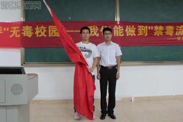 禁毒预防宣传小分队”旗帜授予我校青协主席;紧接着,宣讲活动正式开始,汪腾老师从毒品的基本知识、毒品的危害、毒品的预防三个方面对大家进行了精彩的讲授;活动最后,大家纷纷在宣传横幅上留言,表示“无毒校园,从我做起”。