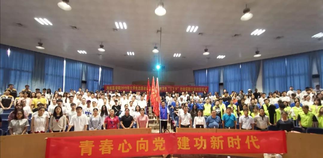 2019年大学生志愿者暑期文化科技卫生“三下乡”社会实践活动动员大会在多功能报告厅隆重举行。学校学生工作处邝家旺处长、校团委曾梅书记、热带医学与检验医学院党委郑文芝书记、口腔医学院党委薛伟波书记、第一临床学院张万科副书记、国际教育学院袁勇副书记、药学院张小坡副院长出席会议并在主席台就座。二级学院团委书记,社会实践指导教师及社会实践队员400余人共同参加了动员大会。会议由校团委林仕芬老师主持。