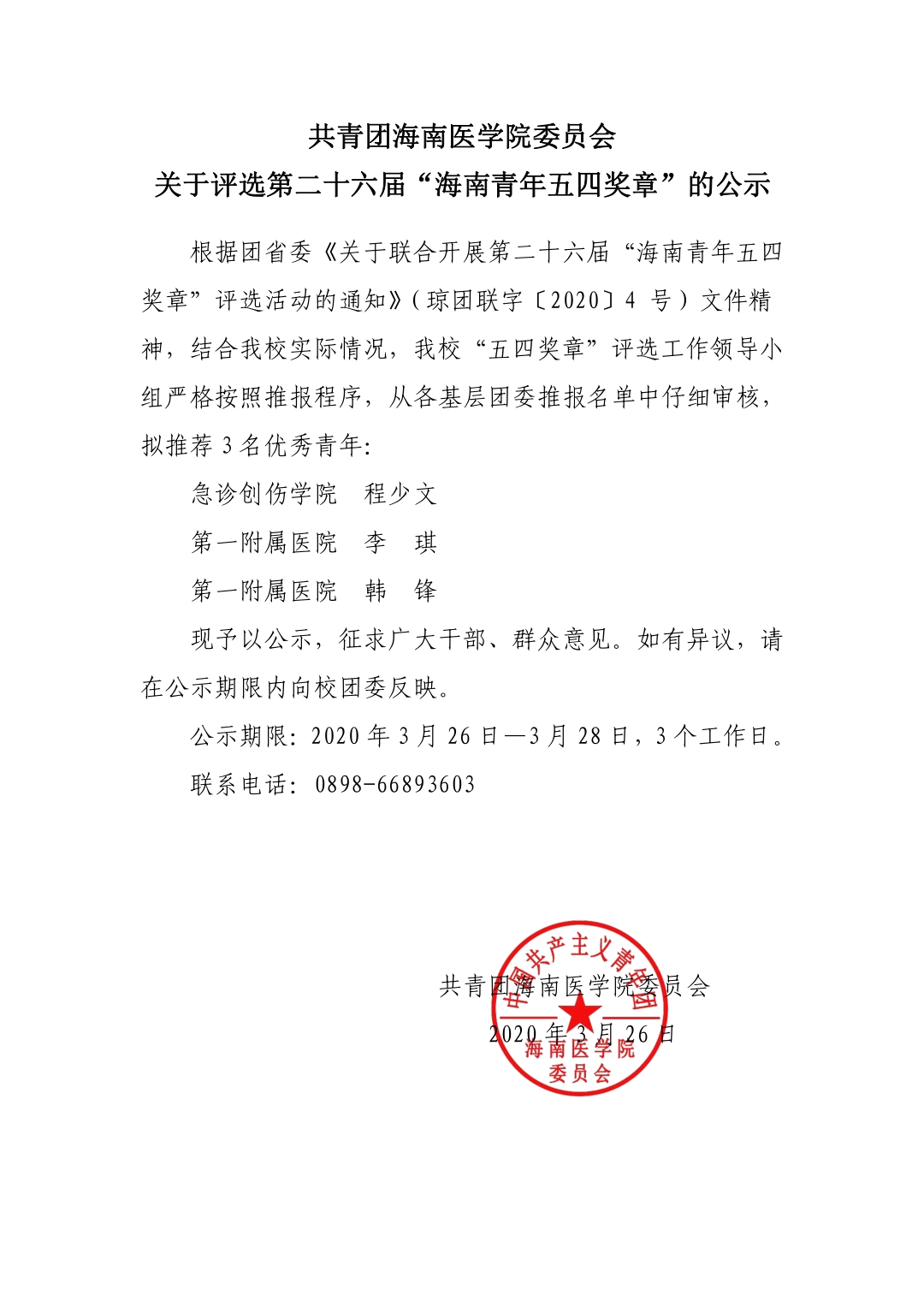 关于评选 2019 年度“海南省优秀共青团员,优秀共青团干部,五四红旗团委(团支部)”的公示