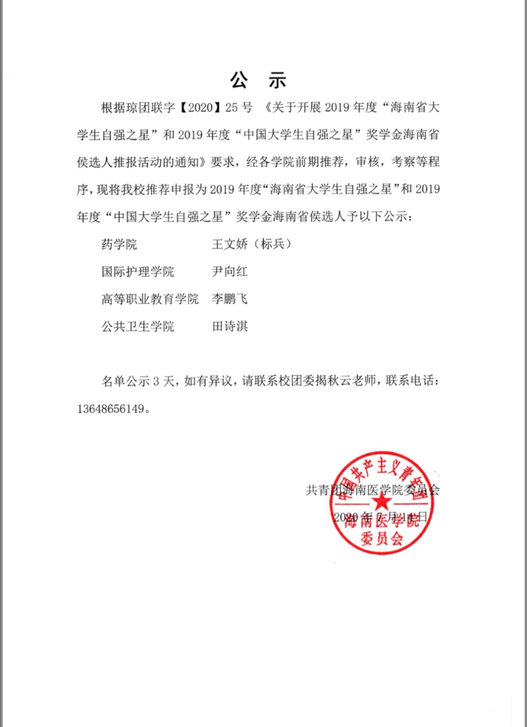 我校推荐申报为2019年度“海南省大学生自强之星”和2019 年度“中国大学生自强之星”奖学金海南省侯选人