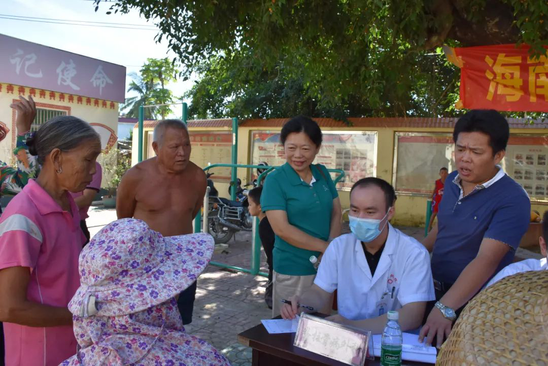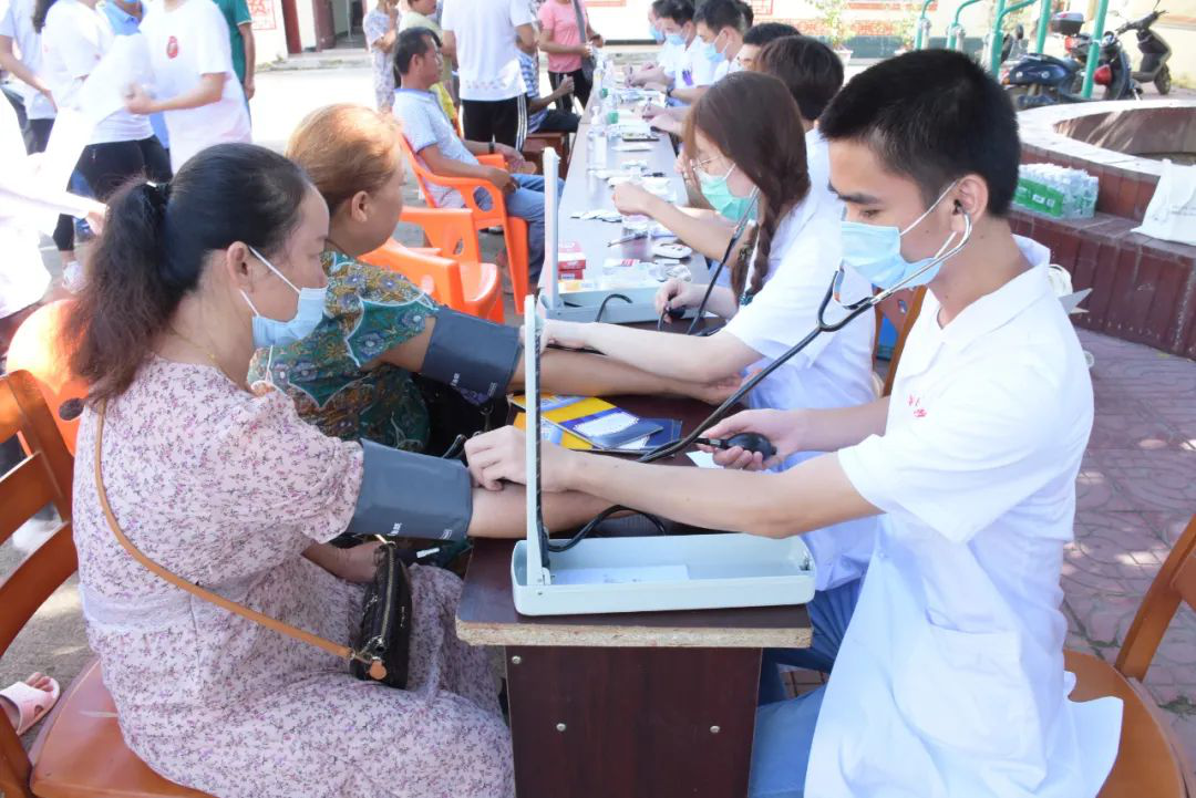 早8时30分,医疗服务队在 热带医学与检验医学院副书记、番豆村驻村第一书记王基鸿的协助下,于村委会组织开展义诊赠药活动, 第一附属医院专家为村民提供专家面对面问诊、开方赠药。同时,团队的学生志愿者也在现场为村民测量血压、血糖,普及高血压健康相关知识。