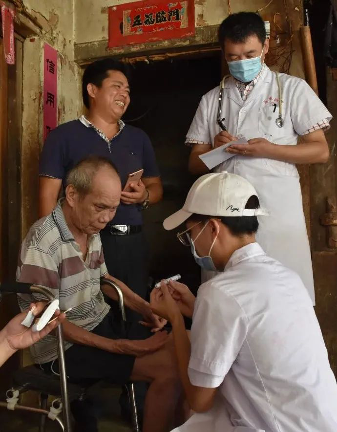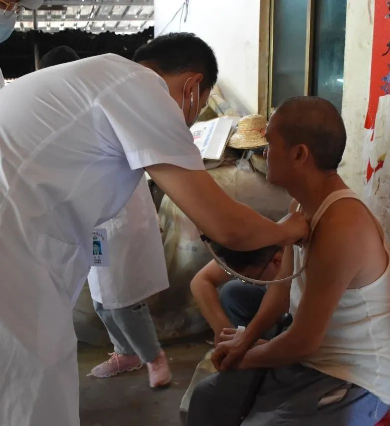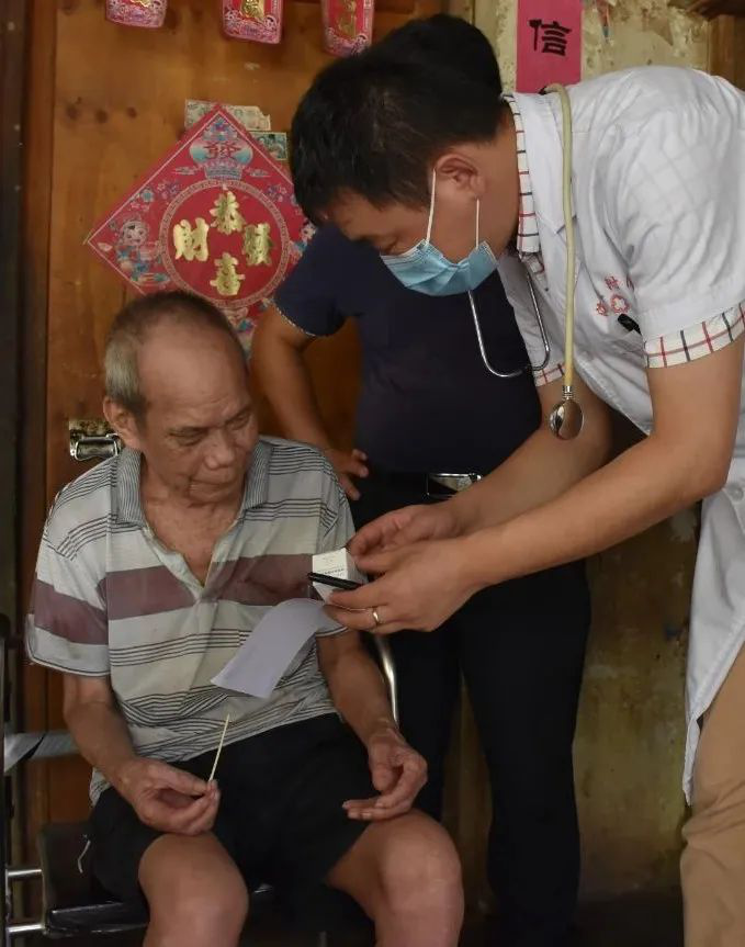10时30分, 第一临床学院党委书记冯琼、副书记张万科在番豆村驻村第一书记王基鸿的陪同下,带领专家开展送医入户活动,对番豆村对口扶贫户进行走访,为贫困户提供高质量的医疗服务。其中,较为特殊的符某一户,是我院继2018年、2019年精准医疗扶贫活动后第三次走进他的家中,通过 第一附属医院心内科张玉卓医生的问诊,我们认识到年迈的阿公因年初摔伤以及常年的高血压,体型相较去年变得十分消瘦,并且心源性水肿的问题仍未解决。了解情况后,张玉卓医生联合村卫生院的文医生为其制定了长期跟踪治疗计划,切实提供高质量医疗服务,实现精准医疗扶贫。