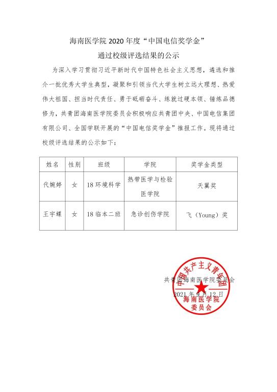 第1页 2020年度“中国电信奖学金”通过校级评选结果的公示