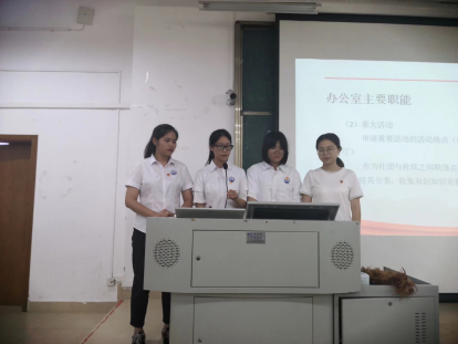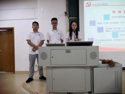 会议开始,主持人组织全体成员歌唱中国共产主义青年团团歌—《光荣啊,中国共青团》。歌曲慷概激昂,激发全体成员爱国热情,歌声热情饱满,展现青年昂扬向上风貌;会议第一项内容,各部门部长对部门的职能,活动,注意事项等做简要报告。让干事了解社联各部门,增强集体观念、自豪感,使各部门上下一心,团结合作,有助于社联未来工作有序进行;会议第二项内容,由主席团简述个人情况及分管部门。各位主席的介绍增强了新生干事对社联的理解,主席的演讲动人心弦,鼓励各位干事纠正工作态度,注重礼貌,遵守规矩,兢兢业业,协调好学习与工作的关系,为干事指引前方的道路;会议最后,全体成员观看爱国影片,接受爱国主义思想,教育培养爱国情怀,鼓励全体成员将爱国之心化为报国之行。