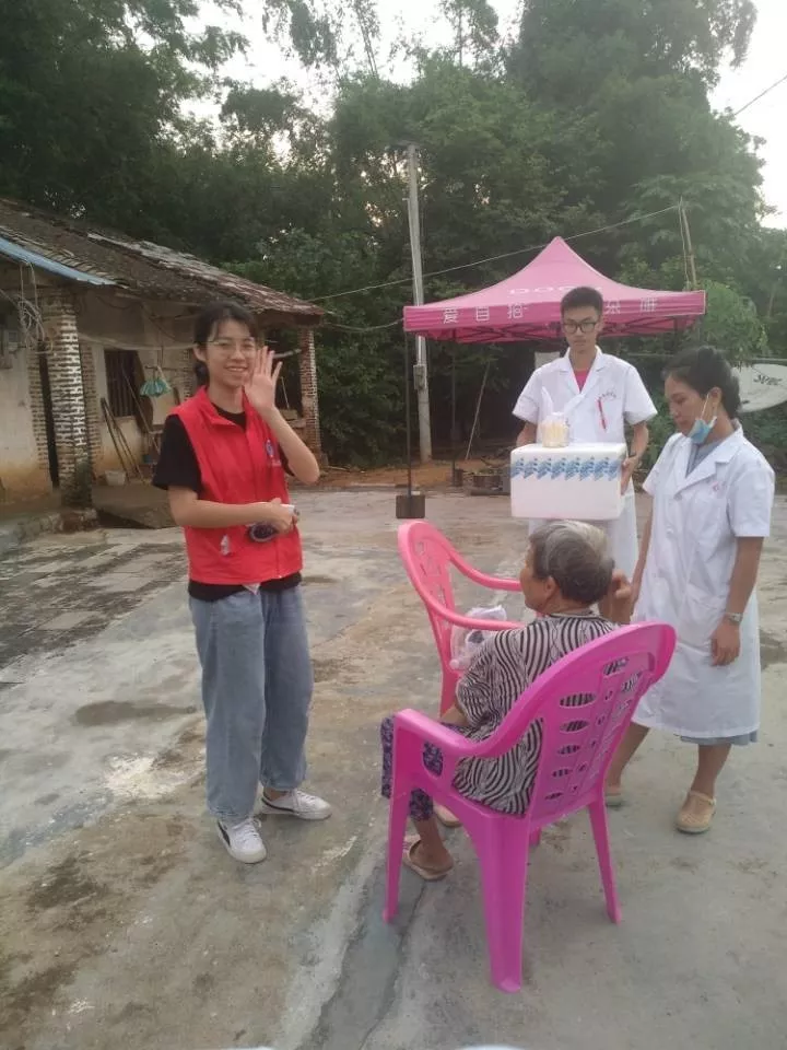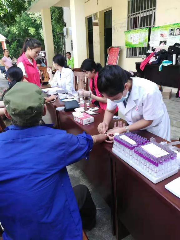 下午3点半左右,一场阵雨拖延了我们出发的时间,4点10分左右赶往下午的第二站——福英村委会。福英村委会是当地的党员群众之家,广场宽大,两株高大的枇杷树遮天蔽日,造福当地一方百姓。拉风的乡卫生院的车把我们拉到的时候,村民们有些已经在枇杷树下等候了,大家热切地盼望着我们的到来。很多阿公阿婆都来了,最开心的是连妈妈也愿带小宝宝来抽血检查。