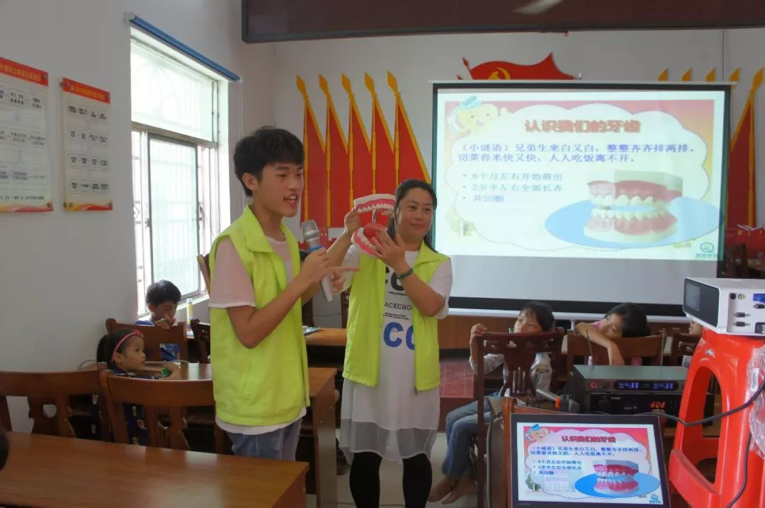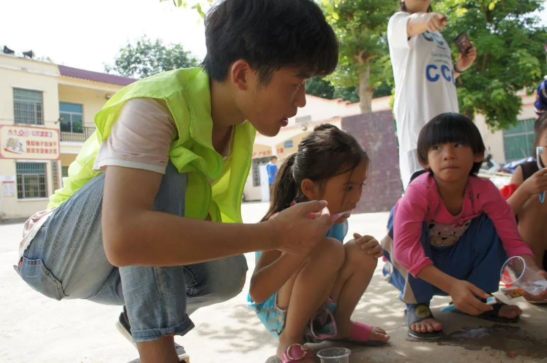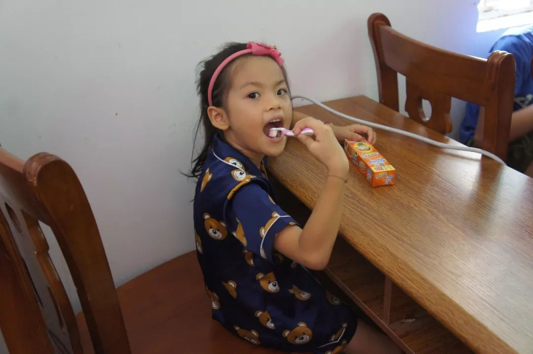 孩子们激动地拿起牙刷,一步一步跟着我们任凯哥哥刷起牙齿。