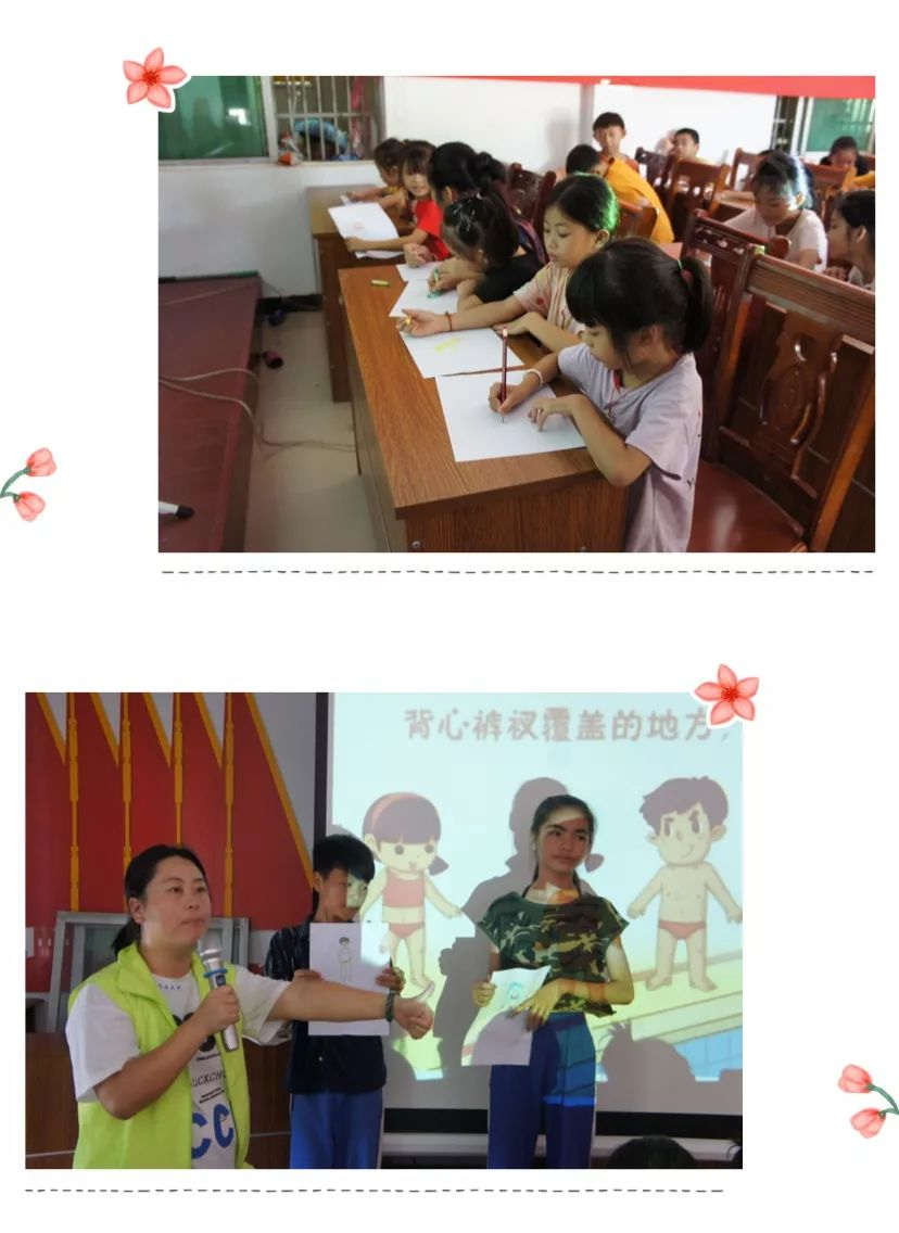 为增加孩子们的“防性侵”意识,文化扶贫小队为孩子们开展了一堂生动的自我保护教育课,让孩子们了解到什么是性侵、性侵的主要犯罪人群有哪些、如何识别性侵害以及遇到性侵时该怎么办...