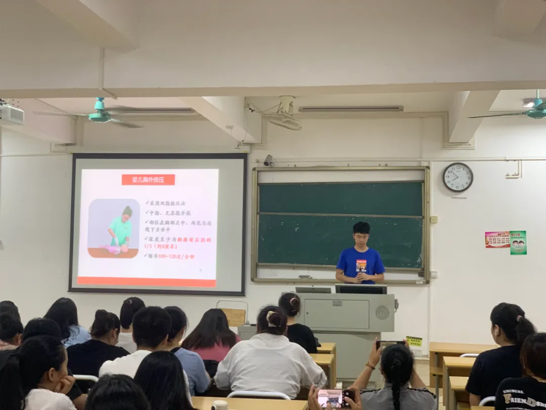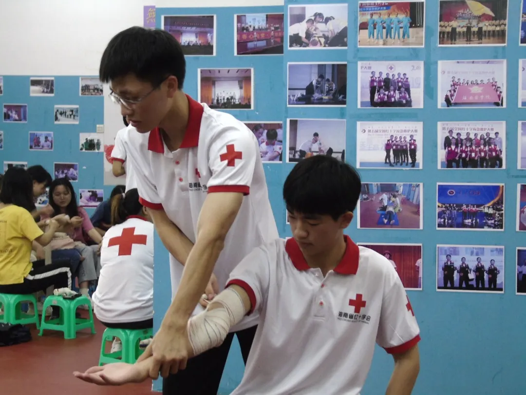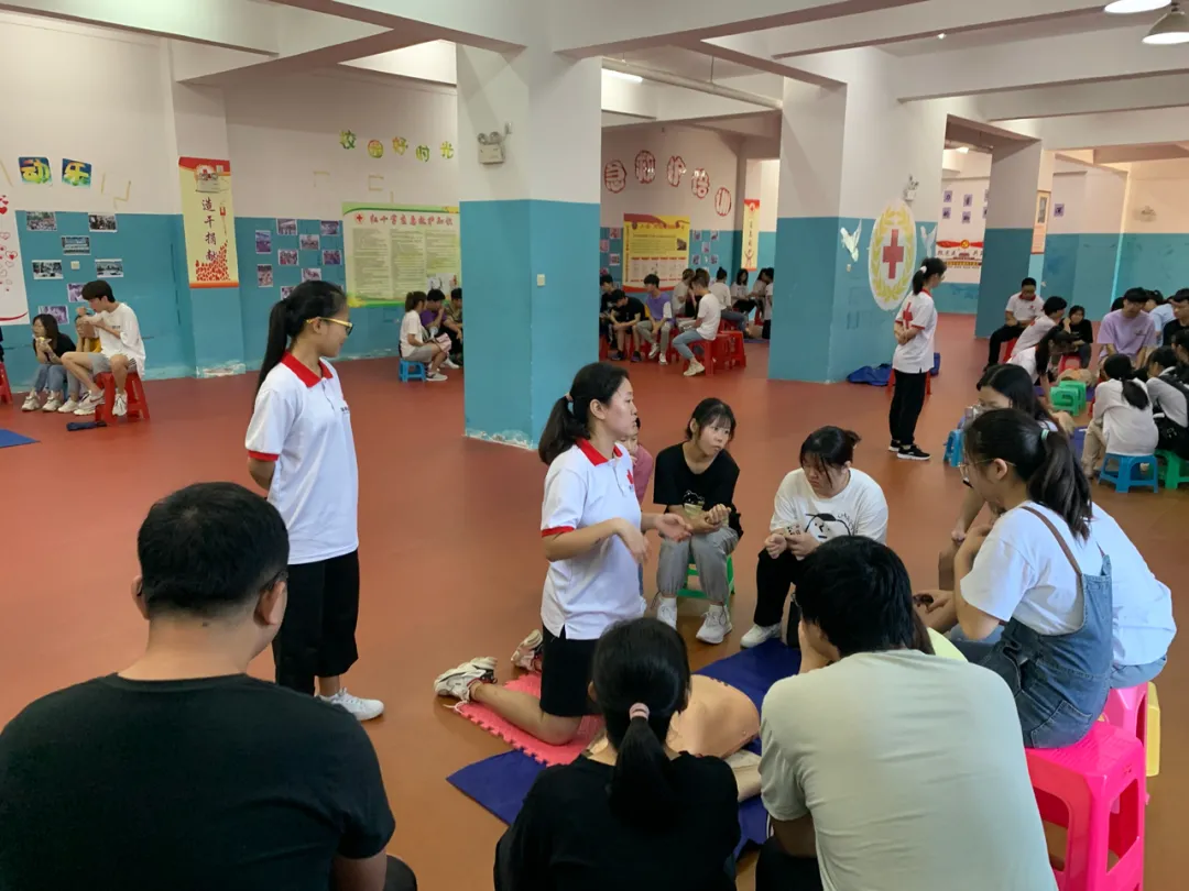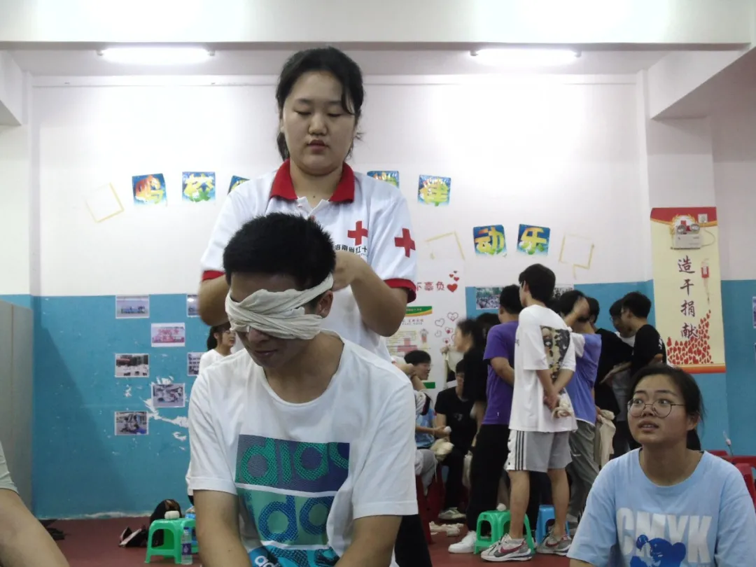 红十字会于5月28号晚上7:30在4-108进行了急救理论知识培训,于5月29日上午8:30~12:00在宋子文体育馆开展了心肺复苏技能的培训,于5月29日下午14:30~6:00在宋子文体育馆举行了创伤包扎的实操教学。