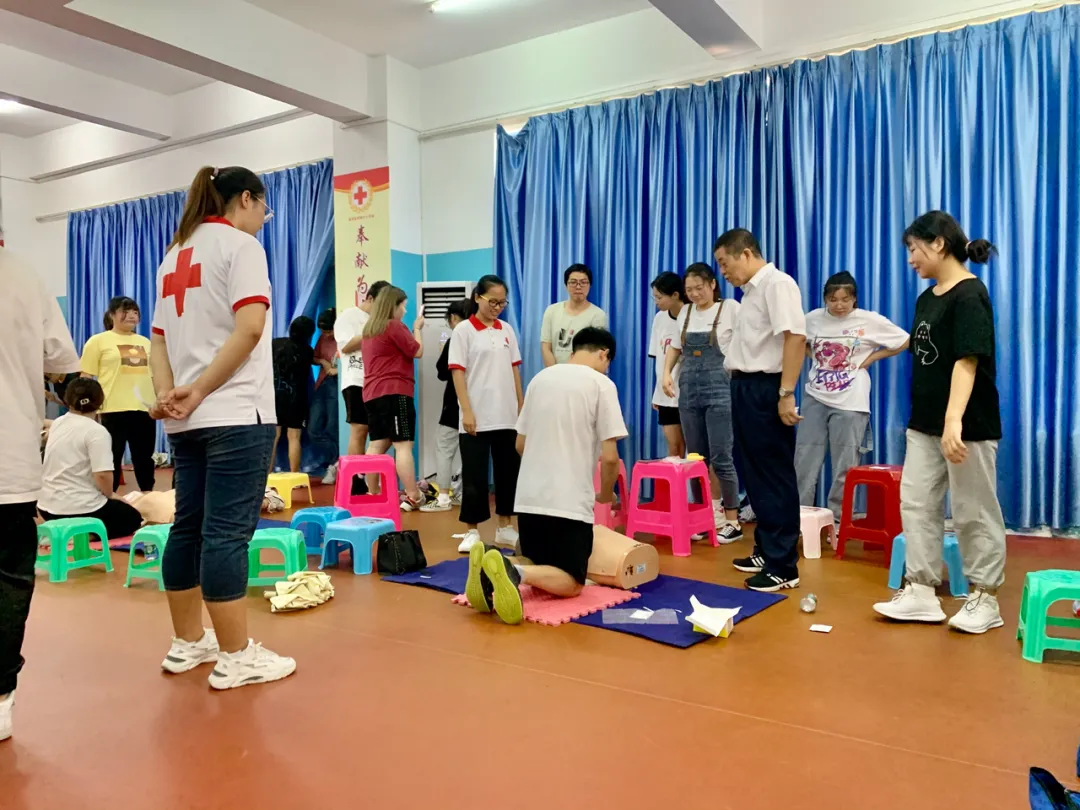 同学们在红会助教们的指导下,认真学习了心肺复苏操作的完整流程,系统的教学使同学们最大程度地参与到学习中,并有机会参与心肺复苏术的操作演练。