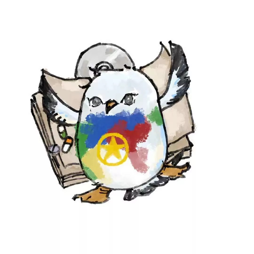 的医学宝鼎,手上拿着椰子和挥舞着团旗,身后还背着代表着医学的针筒