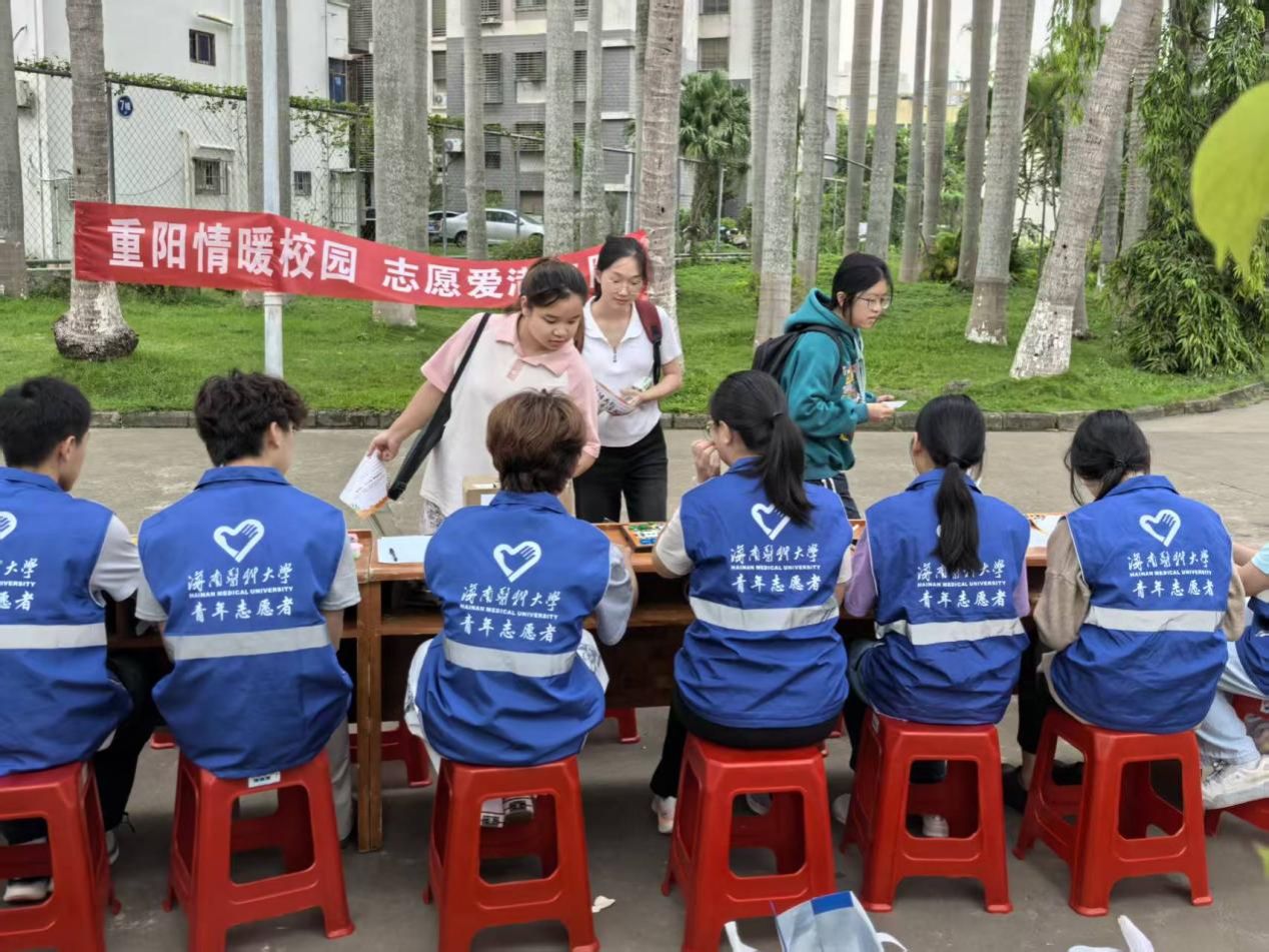 2025年10月25日,海南医科大学一食堂门前开展“重阳共叙,岁月情长”主题实践活动,27名青年志愿者围绕文化传承与志愿服务开展公益行动,弘扬传统美德。