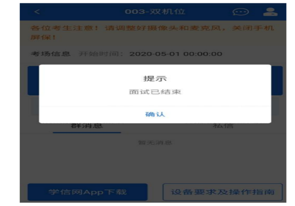 面试仅可由考官端结束,考官结束面试后,考生会收到“面试已结束”的提示,考生点击【确认】即退出考场,且不允许再次进入考场。