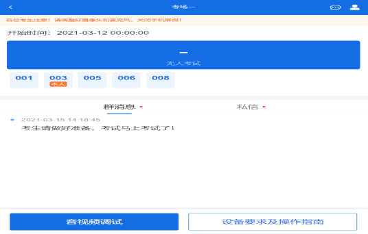 实人验证通过后,考生进入考场候考页面。考生可以查看考试开始时间、考试顺序、考官发送的群消息和私信等。