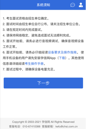 1、远程面试系统由学信网开发,参加考试须校验考生学历学籍信息、人脸实人验证,考生应提前检查自己的学信网登录账号是否能正常使用,能否正常登录学信网APP,如忘记密码请及时联系学信网找回密码,以免耽误考试。
