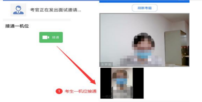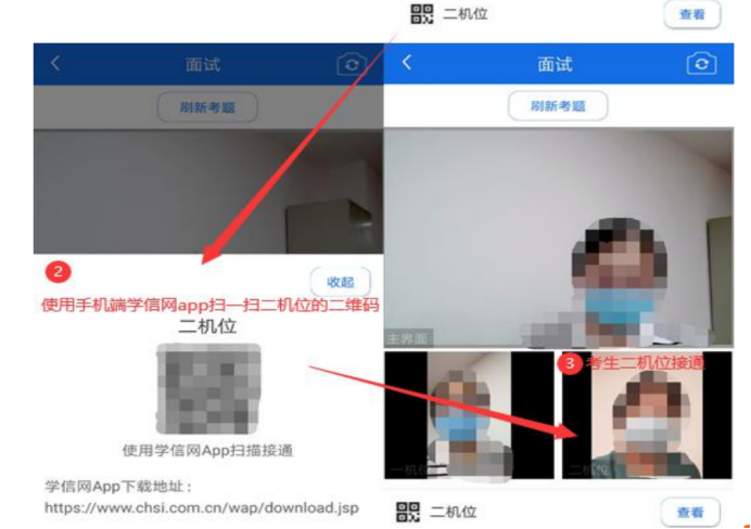 我校远程面试统一使用双机位模式,考官发出面试邀请后,考生候考区会收到面试邀请,考生首先接通一机位,点击【接通】按钮,进入后用二机位设备学信网APP扫描二机位二维码,接通二机位画面。一机位为考生面试界面,考官和考生实现远程视频面试。二机位仅显示考生的视频画面,不支持音频播放及采集(即二机位仅显示考生静音状态的视频画面)。 考官给考生发送的试题可通过页面右上角【刷新试题】展开下拉菜单后查阅。