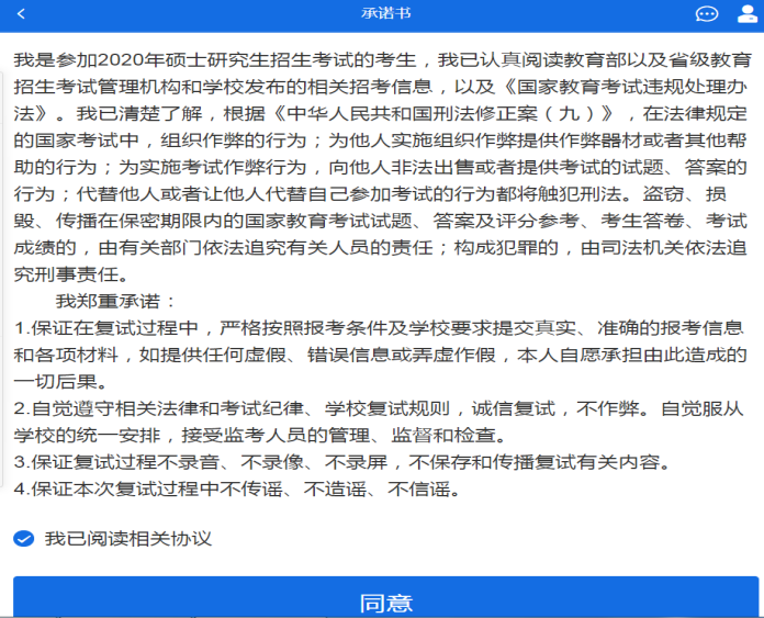请考生认真仔细阅读,勾选“我已阅读相关协议”并点击【同意】按钮。
