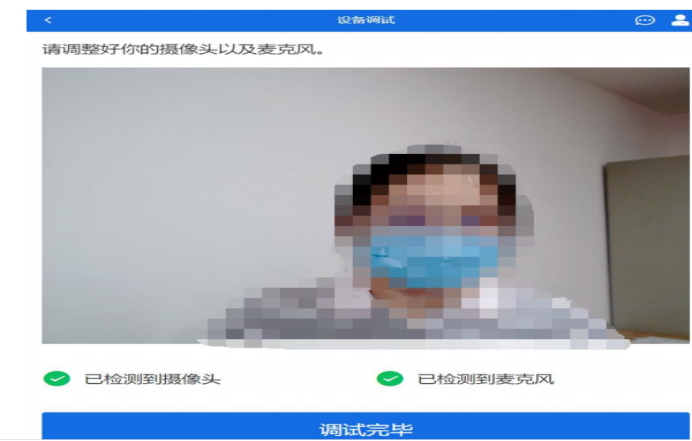 点击【音视频调试】按钮进入调试界面。若设备有多个摄像头,可点击【转换摄像头】按钮转换,若设备仅有一个摄像头则不可转换。调试界面的图像无异常后,点击【调整完毕】结束调试返回考场候考区等待考官发送面试邀请。(调试设备功能,网页端提供,移动端不提供。)
