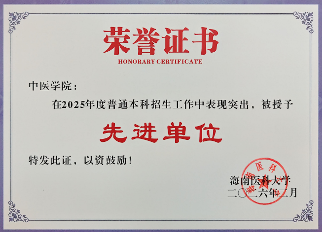 2026年3月11日,海南医科大学普通本科招生工作总结表彰会议顺利召开,中医学院凭借规范严谨的工作管理、创新多元的宣传举措、成效突出的招生实绩,荣获“普通本科招生工作先进单位”荣誉称号。这是对我院在豫招生工作的高度肯定,更是学院全体招生工作人员深耕中原、履职尽责、协同奋进的丰硕成果,彰显了我院在跨区域中医药人才招生培养中的责任与担当。