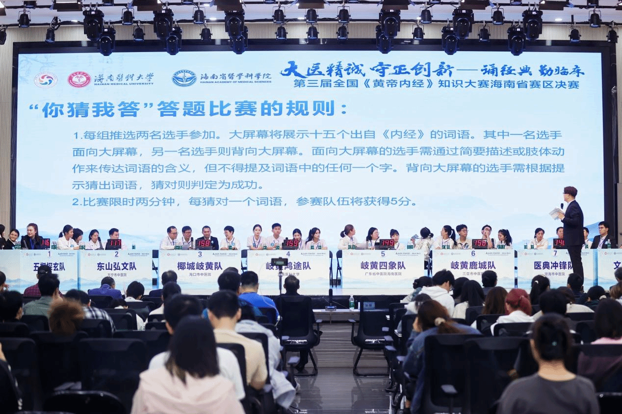 为深入学习贯彻习近平总书记关于中医药工作的重要论述,落实《中共中央 国务院关于促进中医药传承创新发展的意见》,推动中医药经典教育高质量发展,在海南自贸港国际化建设的蓬勃浪潮中,椰林飘香里裹挟着《黄帝内经》的千年墨香,2025年11月23日上午,第三届全国《黄帝内经》知识大赛海南赛区决赛在海南医科大学城西校区立言厅正式开赛。本次大赛由中国教育电视台、中华中医药学会、世界中医药学会联合会等九家权威单位联合主办,海南医科大学(海南省医学科学院)精心承办,以“大医精诚 守正创新 —— 诵经典 勤临床”为核心主题,既是中医药学子的知识竞技舞台,更是自贸港背景下传统中医文化“守正根脉”与“出海破圈”的生动实践,为海南中医药事业发展注入强劲动力。