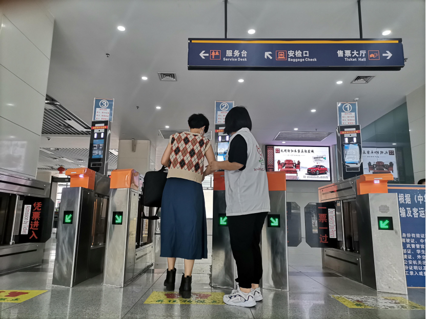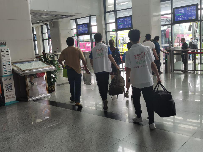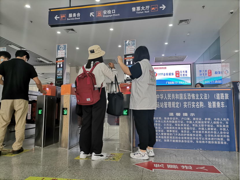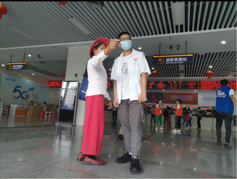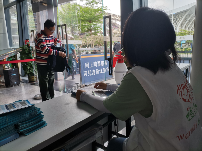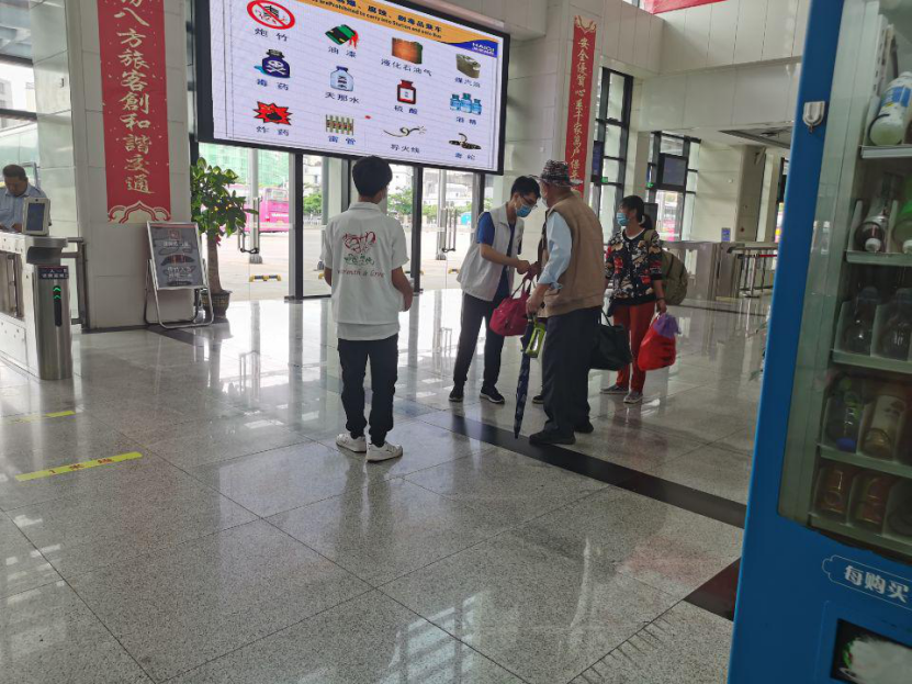 另外,虽然目前我国新冠疫情已经得到控制,但车站是出行比较复杂、人流量大的公共场合,为了自己和大家的健康,是需要佩戴口罩的。坐在门口的志愿者也都热情且礼貌的提醒过往乘客佩戴口罩。有的乘客行李很多,携带困难,或者是行动不便。我们的志愿者也发挥了作用。从进口到自动售票机,从自动售票机到检票口,从检票口到安检区再到上车的地方,都有志愿者来给乘客搬运行李。