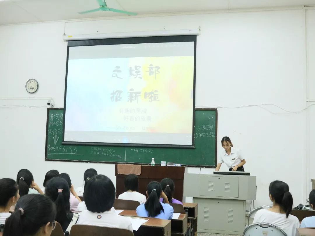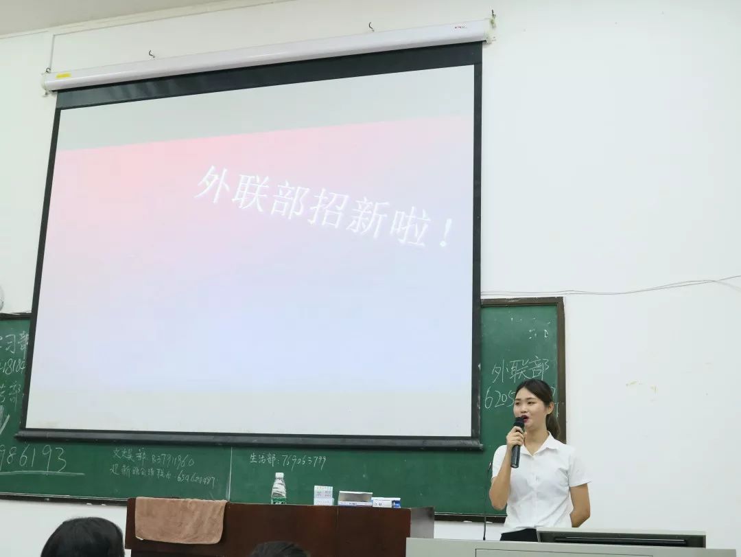 我院学生会由办公室,外联部,学习部,文娱部,体育部,生活部,宣传部共七个部门组成,招新大会上,各个部门依次展示了各自的风采,将自己部门的特色呈现给新生们。