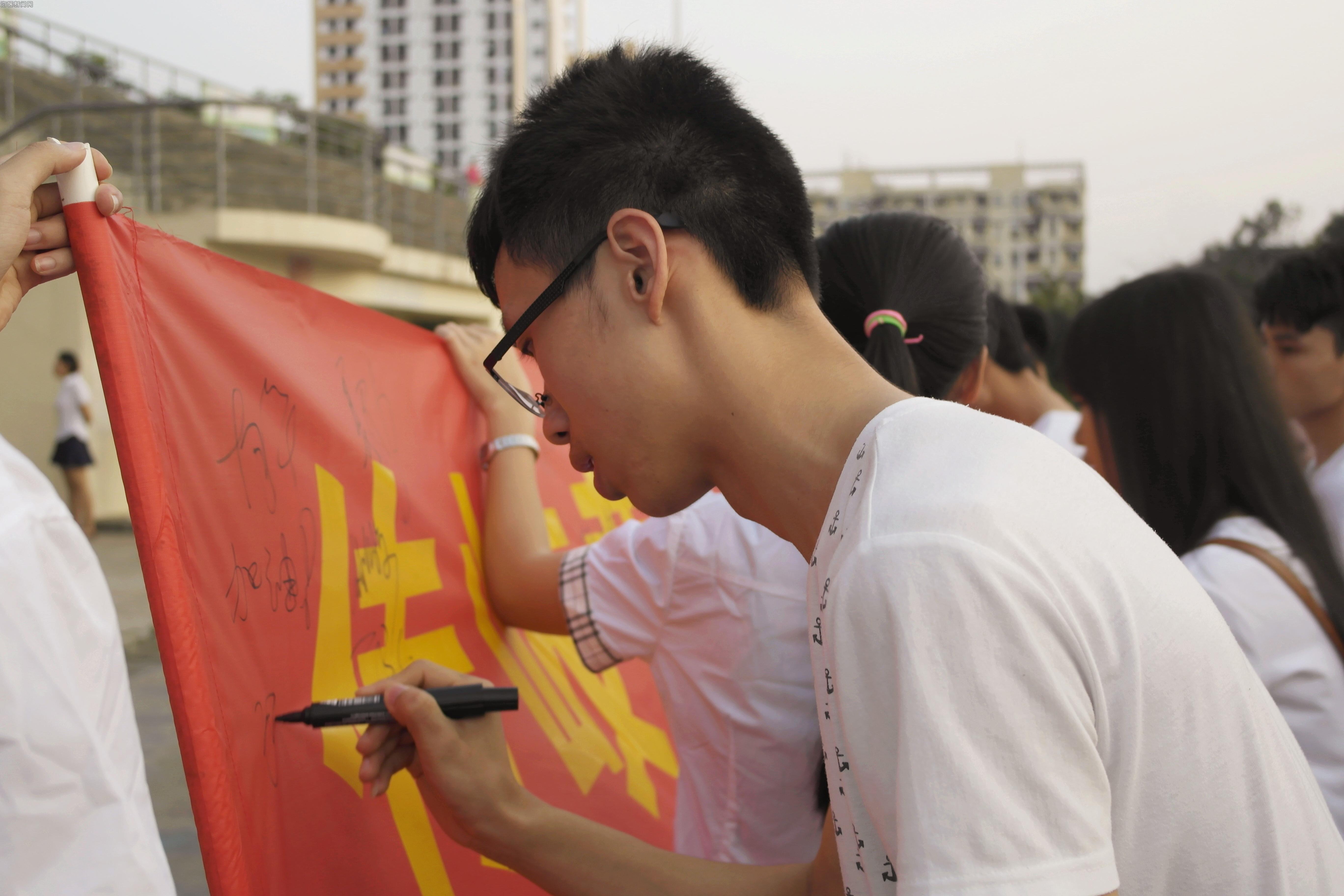 同学们在启动横幅上签下自己的名字