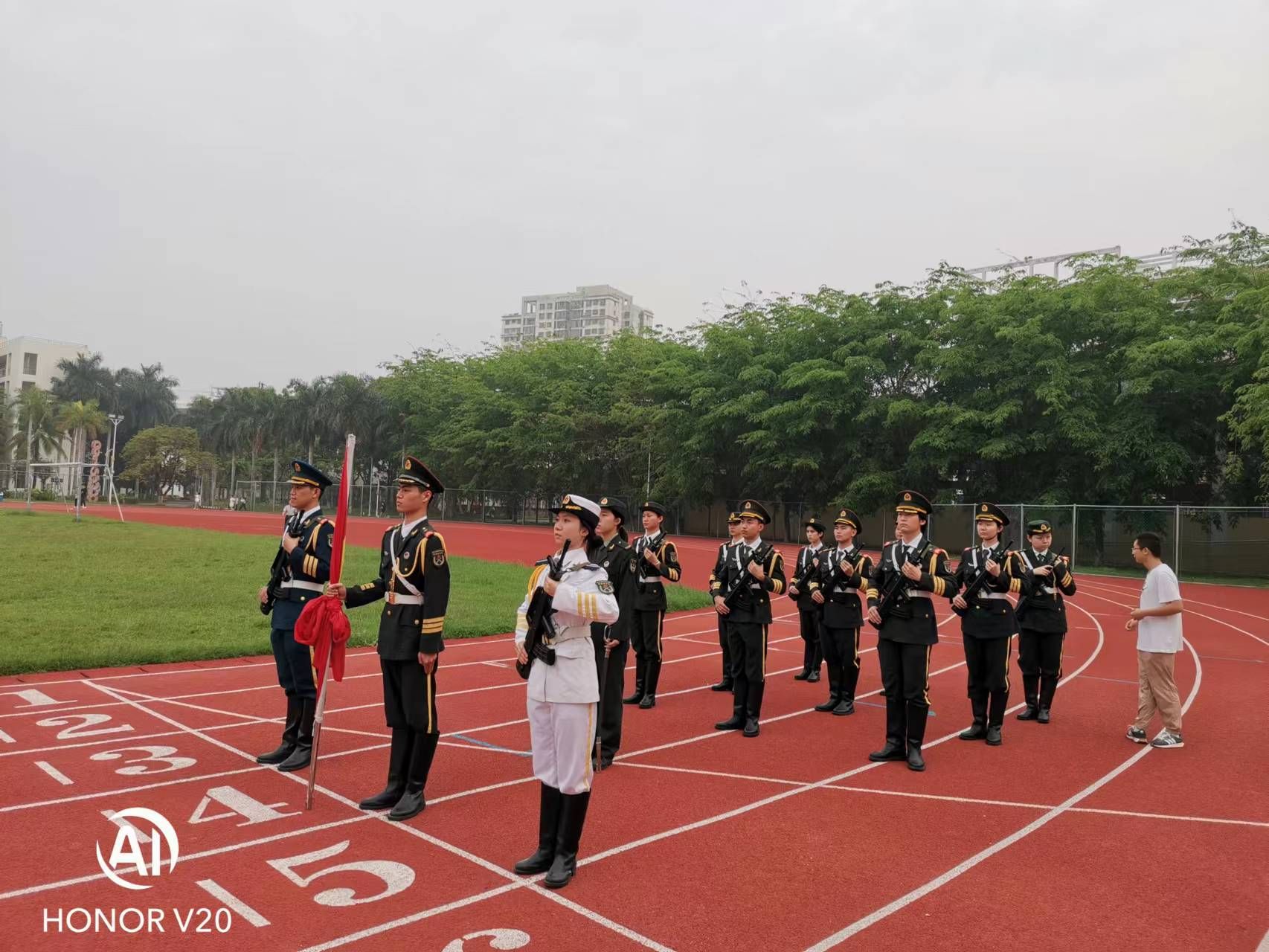 中医学院全体师生在田径场举行了隆重而庄严的升旗仪式。
