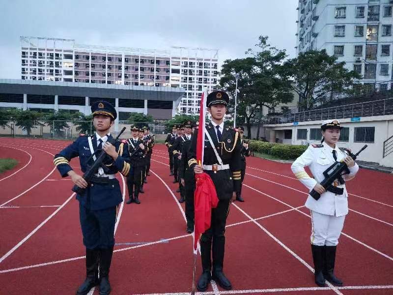 在国旗护卫队的带领下,全体师生肃立,向国旗行注目礼,全体师生共同唱响国歌,国旗缓缓升起,气氛庄严肃穆。